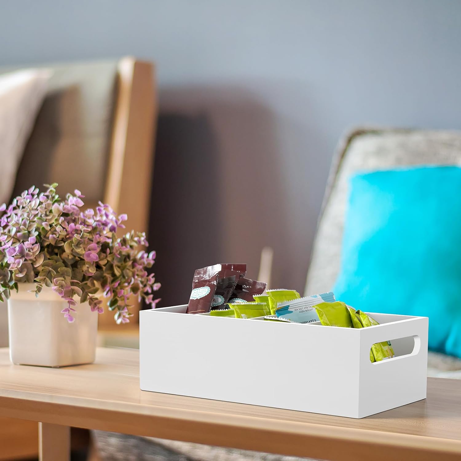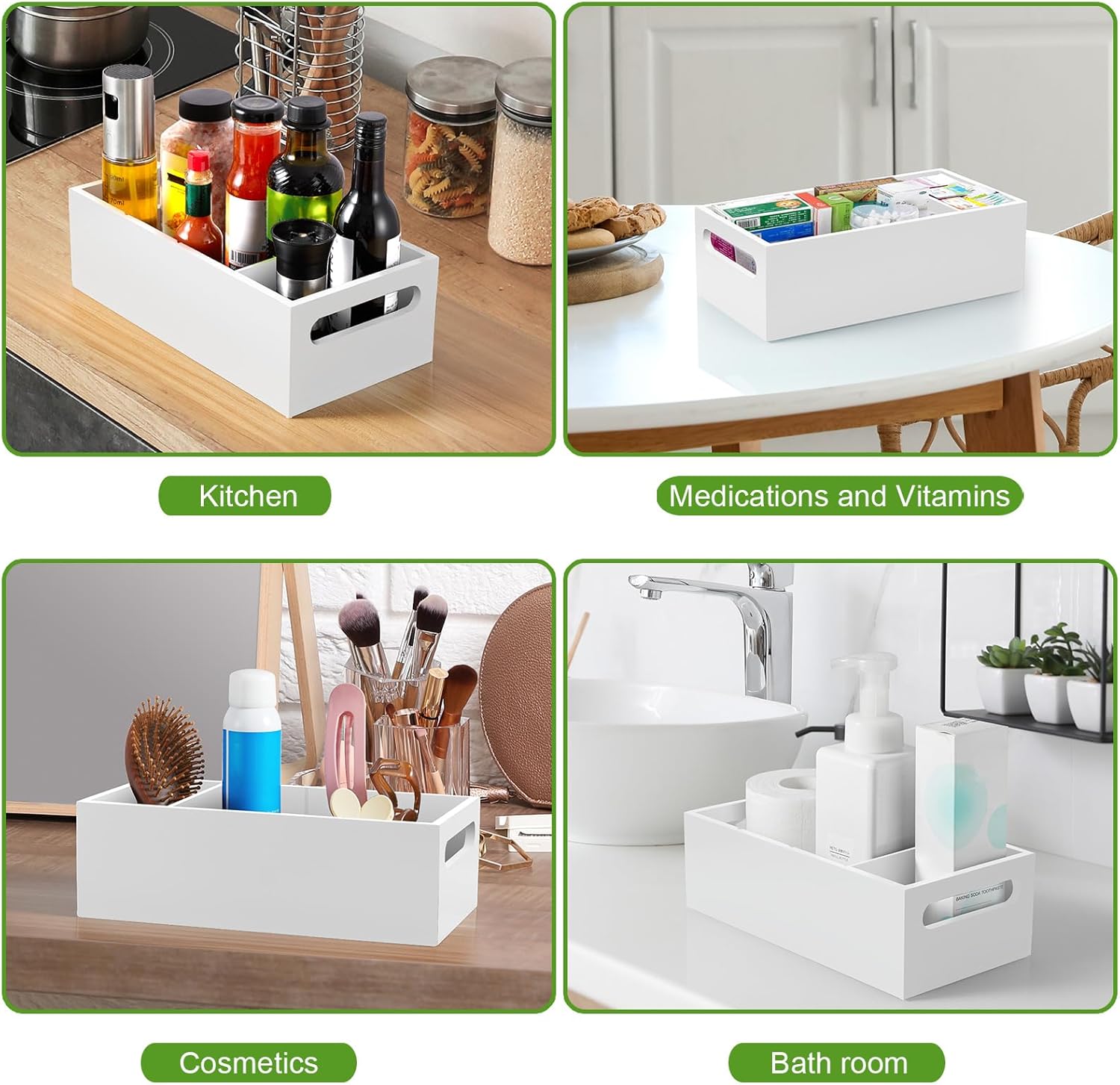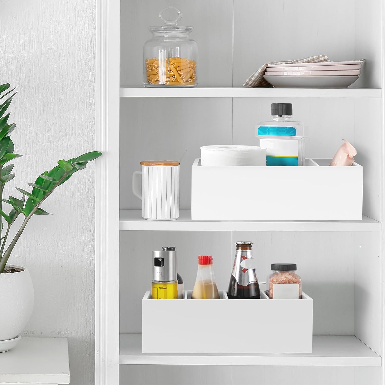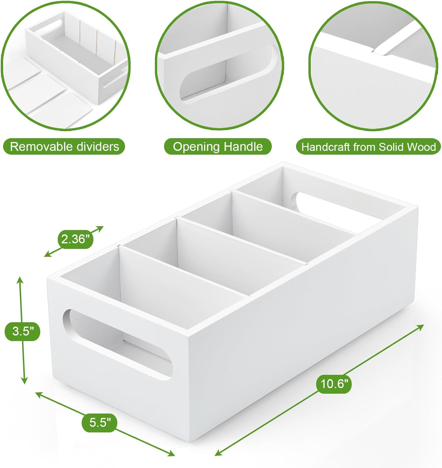 • Customizable compartments: The wooden pantry storage bin has 3 removable dividers, making it easy to adjust the size of the slots for your needs. The dividers are easy to insert and remove. They would work well in the kitchen, cupboards, pantries, kids' snacks, and drawers. You could even use them to organize a medicine cabinet or bathroom cabinet