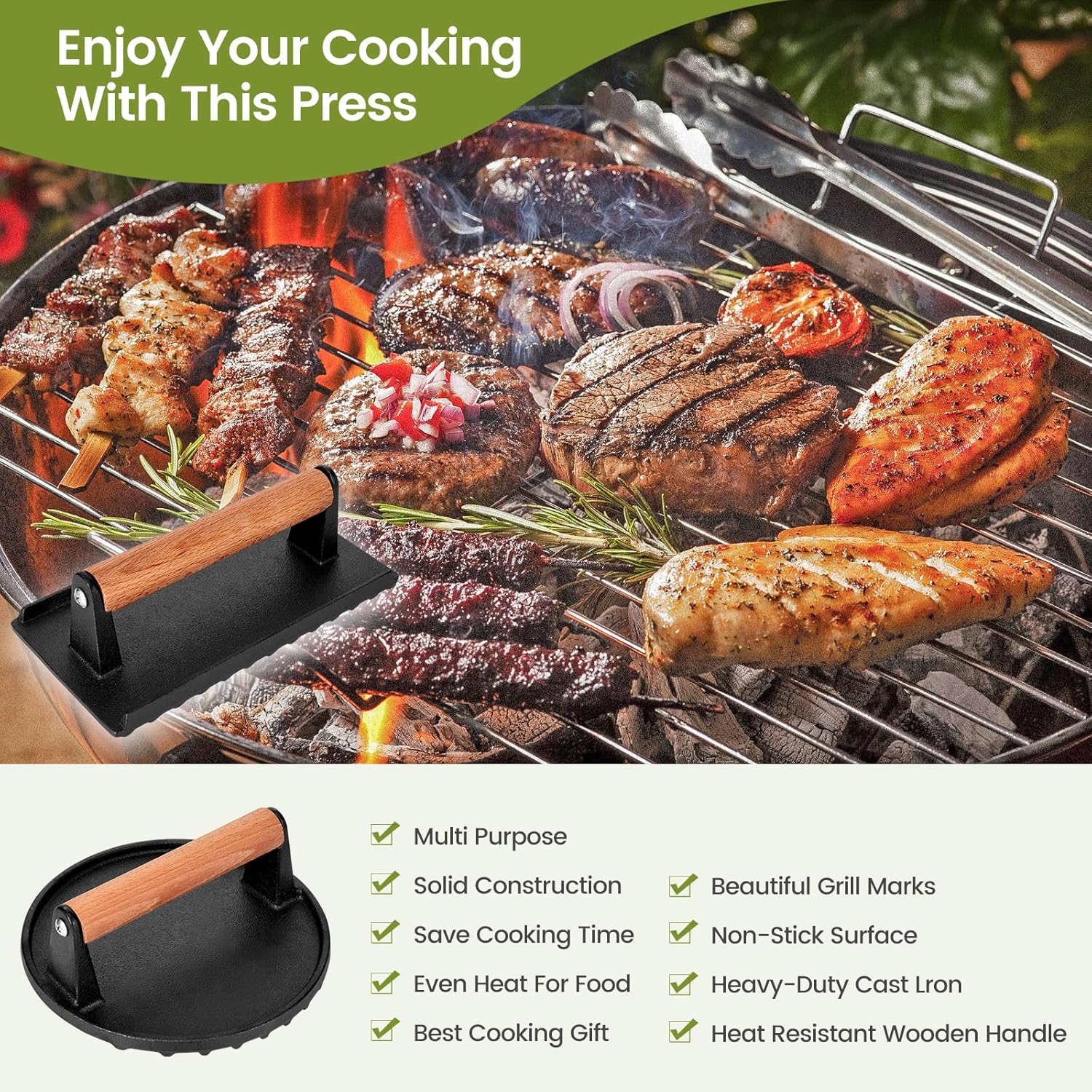 • Food-Grade Cast Iron Burger Press : Our barbeque grill press is crafted from 100% food-grade cast iron without any harmful coatings, the press can also be seasoned like cast-iron skillets to create a non-stick surface; Use the grill weight to press out unwanted grease and fat, flattening the meat and keeping its shape, keeping bacon, steaks, pork chops from curling after pressing. Our smash burger press kit are perfect for Blackstone and provide professional grilling experience at home