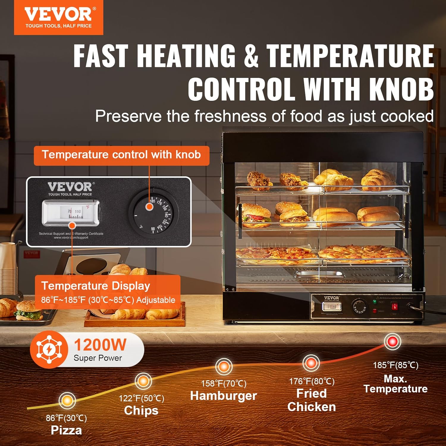 VEVOR 3-Tier Commercial Food Warmer Display, 1200W Food Display Warmer with Light, Adjustable Shelf and Temperature Display, 86℉~185℉ Steam Heating, 111L for Hamburger, Pizza, Bread, Fried Chicken