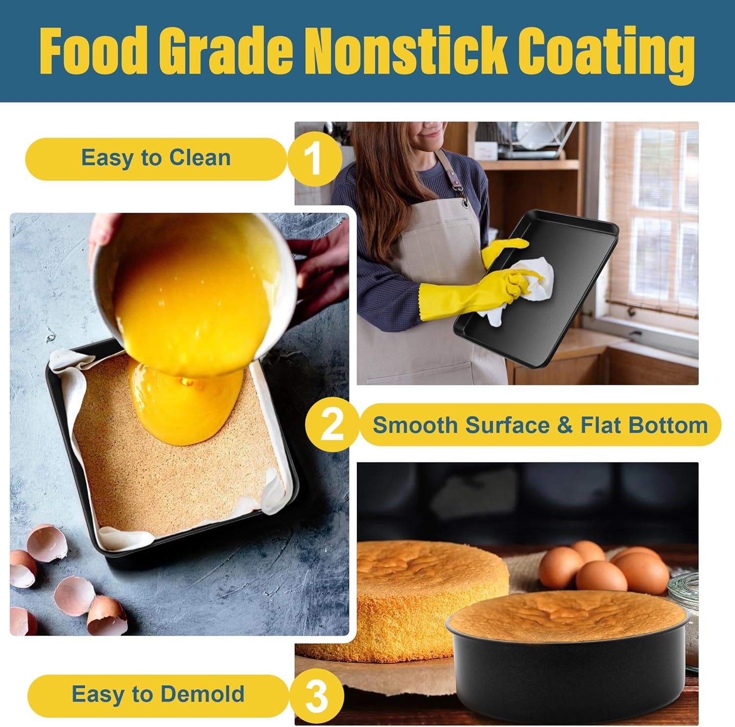 • HEALTHY AND EASY CLEANING COATING: Coated with food grade nonstick coating, No-toxic and no worry of harmful substances released into your food, They are so easy to use that you can throw parchment paper away, Even you spray little oil still can demold cake in a complete shape easily, Less cake/food stick on the sheet pan, which makes low-fat and healthy food, And you can spend less time in cleaning and make cleaning a breeze, Healthy and effortless for every meals