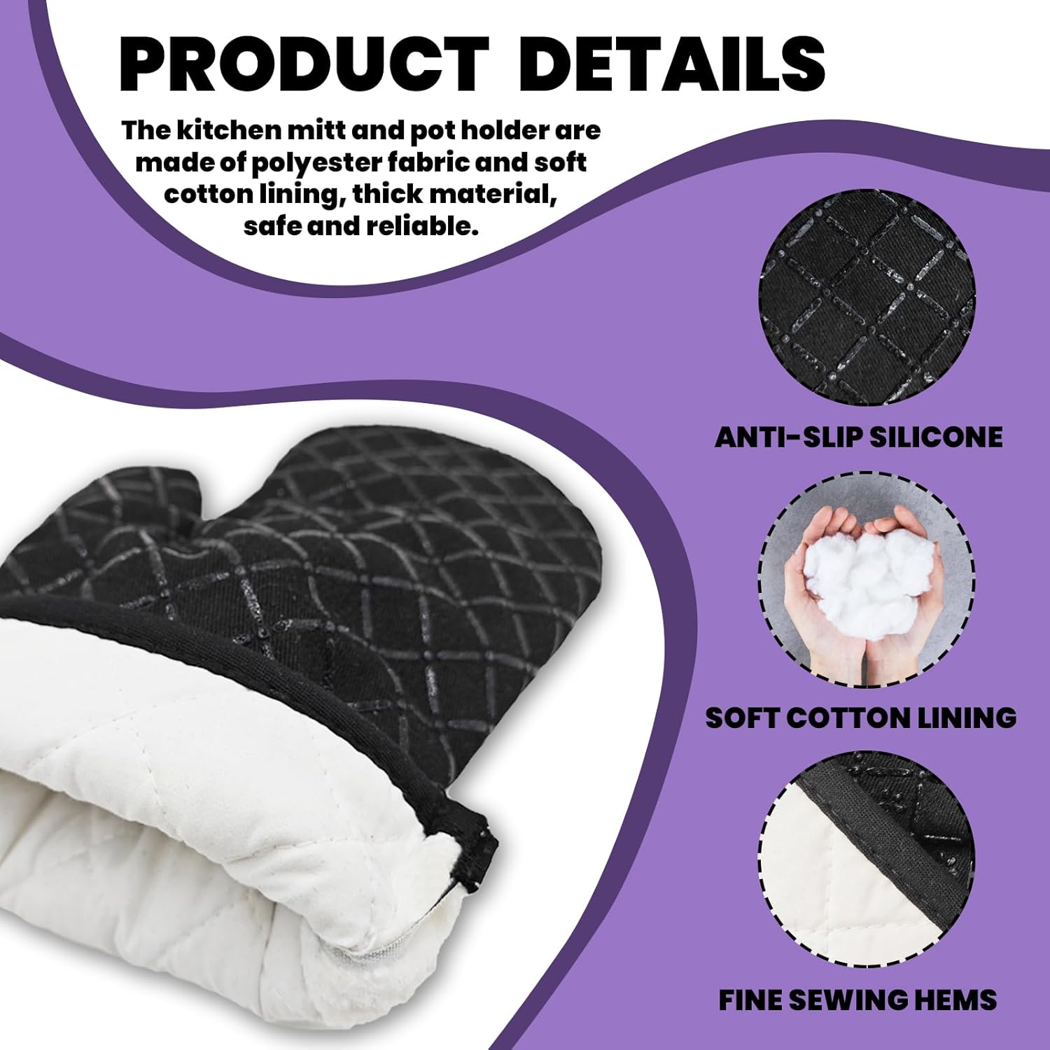 • Non-slip and Durable: The oven mitts and pot holders are designed with silicone, which can improve control and stability when moving or holding pots and pans, making you safer.