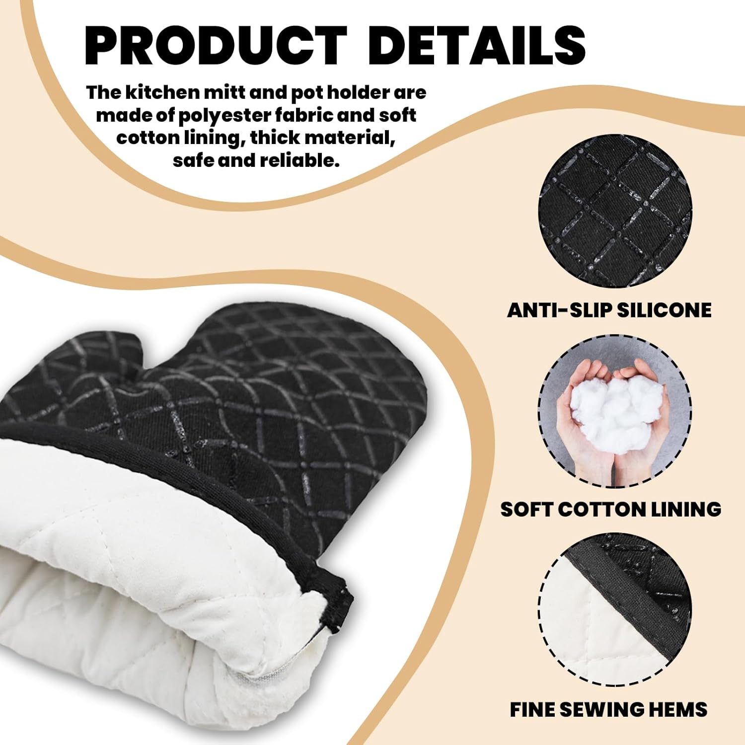 • Non-slip and Durable: The oven mitts and pot holders are designed with silicone, which can improve control and stability when moving or holding pots and pans, making you safer.