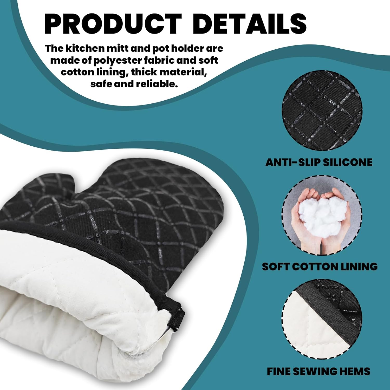 • Non-slip and Durable: The oven mitts and pot holders are designed with silicone, which can improve control and stability when moving or holding pots and pans, making you safer.