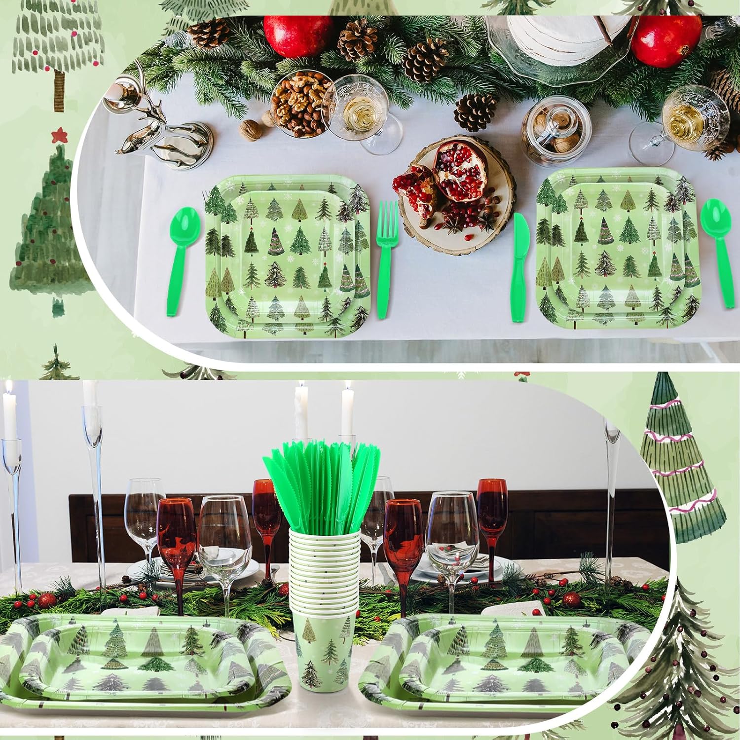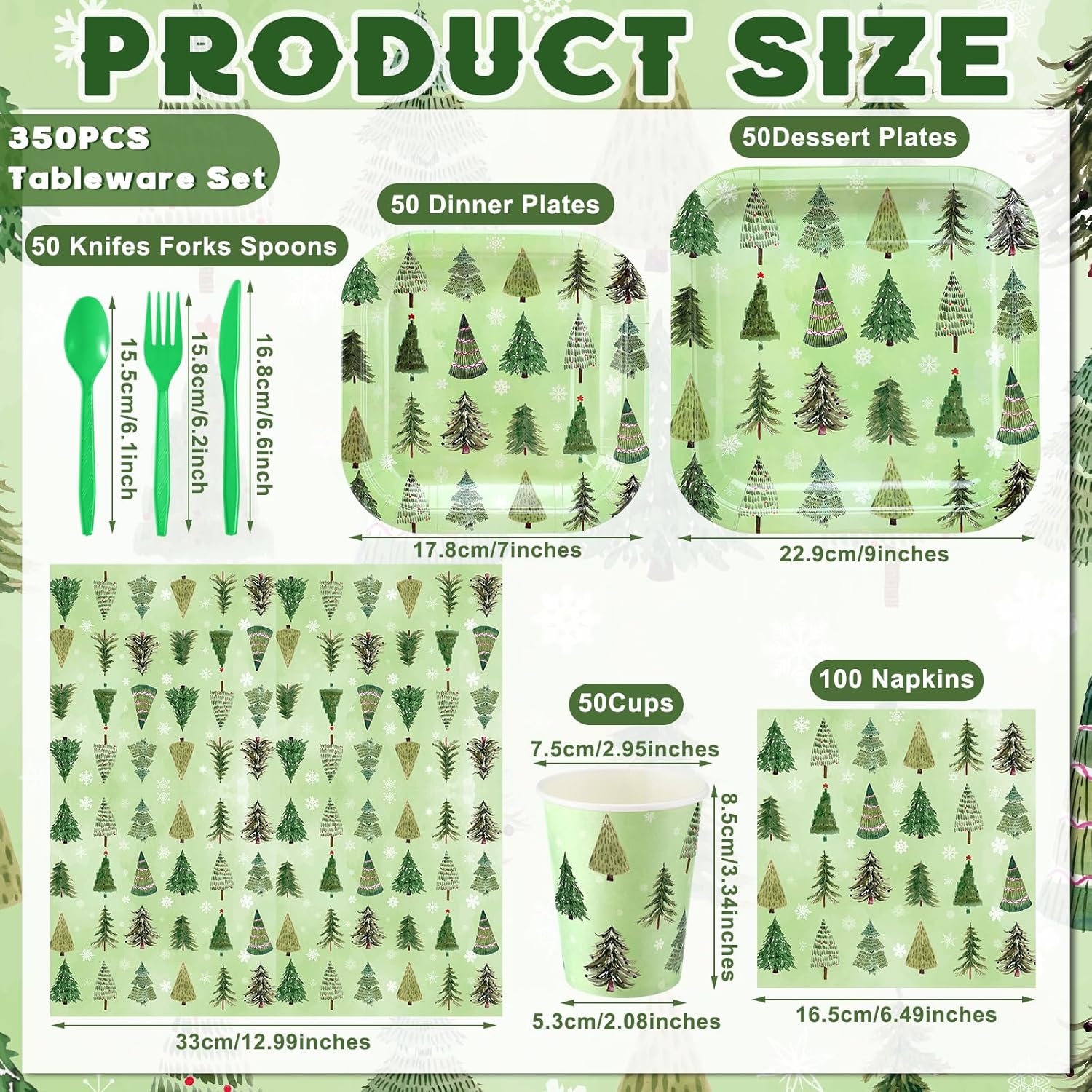 350 Pcs Paper Plates and Napkins Set Disposable Dinnerware Party Supplies Tableware Serve 50 Guest Cups Knife Forks Spoon(Green,Christmas Tree)