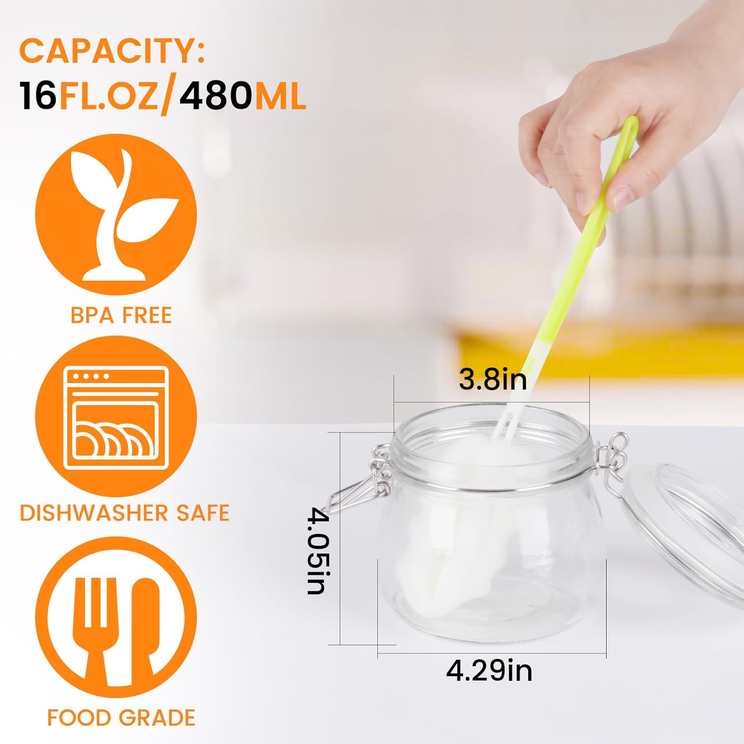 • SPACIOUS & PRACTICAL DESIGN: Measuring 16fl.oz/480ml with 3.8" wide mouth opening, these air tight glass storage jars effortlessly hold bulk ingredients while allowing easy access for scooping and cleaning