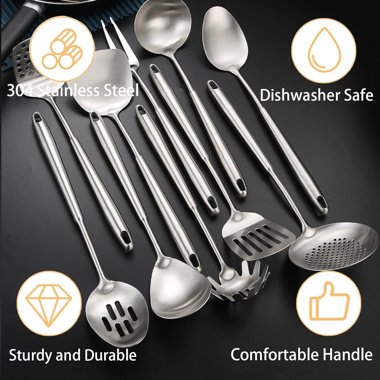 • Enhanced Durability & Shine: Crafted from high-grade stainless steel, these non-toxic cooking utensils assure health-conscious cooks that no harmful elements seep into their meals. The sleek silver finish complements any kitchen decor and adds a touch of sophistication to your countertop.