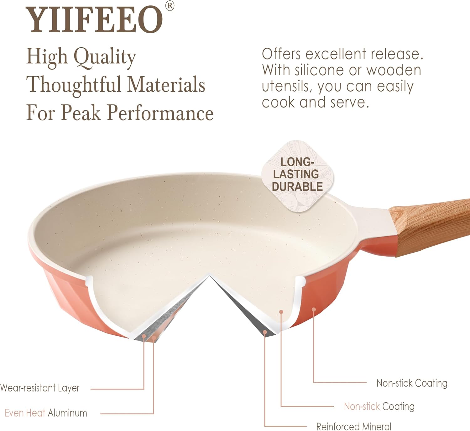 • 【Ultimate Nonstick & Super Easy To Clean】A top level, harder nonstick granite, it provides at least 8x extra nonstick durability, keeping food sliding smoothly. Being an enjoy to both cooking and cleaning, just a little wipe. YIIFEEO pan set keeps stubborn stains out of your life and keeps your passion for cooking.