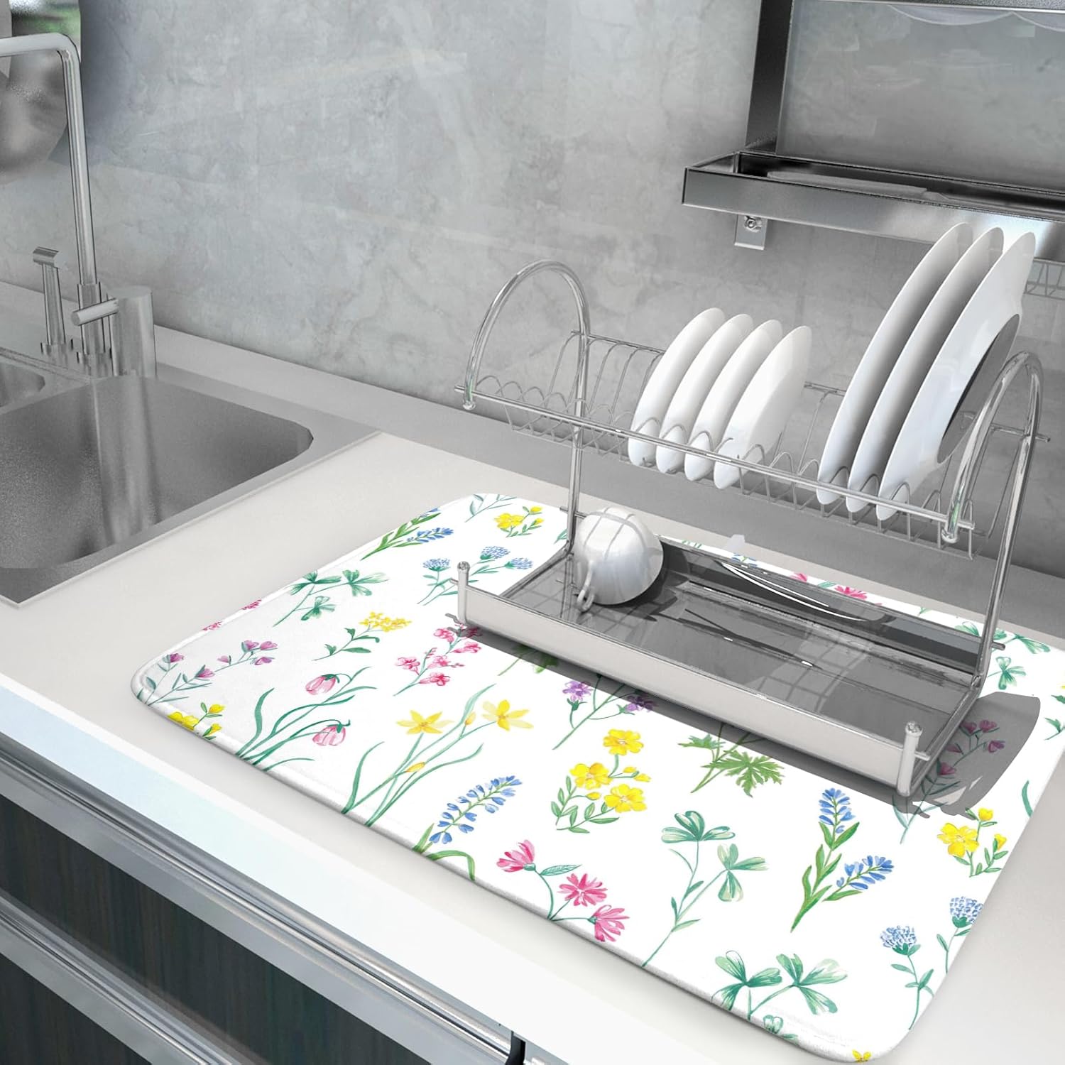 Spring Drying Mats for Kitchen Counter 18×24 Inch Watercolor Flower Large Microfiber Drying Mat Kitchen Accessories Dish Rack Mat Drainer Pad Washable Absorbent