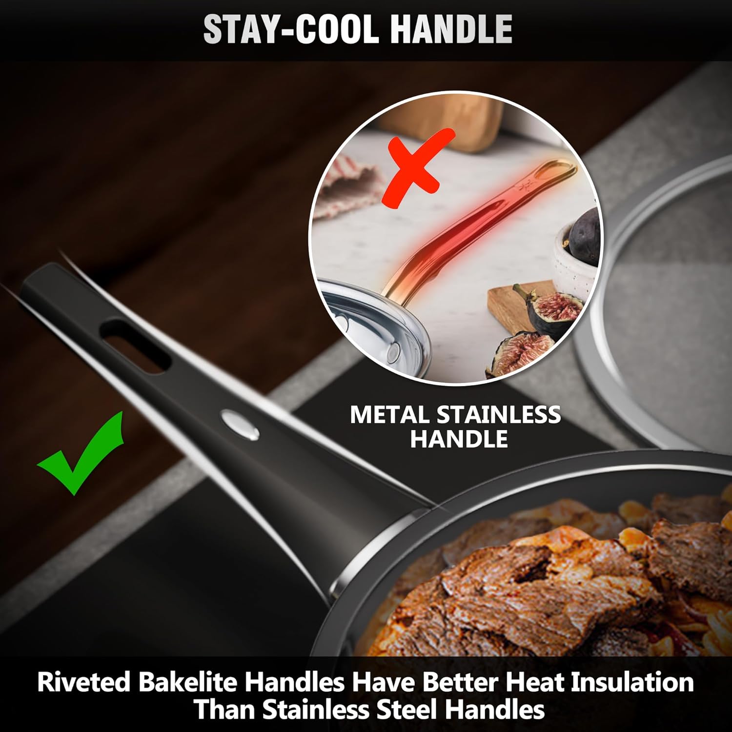 • 【Stay-Cool Handle】The handle of the cooking set is made of PP material, which is different from the stainless steel handle and will not make the handle hot when cooking. TIPS: CANNOT BE PUT INTO THE OVEN