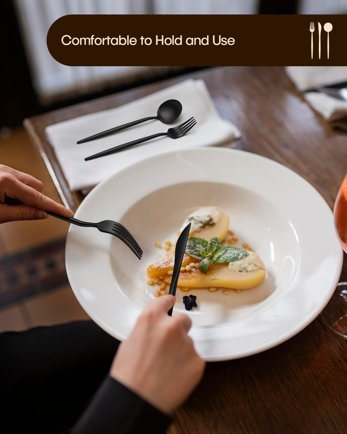 • 60 PCS BLACK MATTE SILVERWARE SET: Including 12 dinner knives, 12 dinner forks, 12 dinner spoons, 12 salad forks, and 12 teaspoons. These silverware sets for 12 are perfect for daily home use, and also for restaurants, pubs, cafes, and hotels