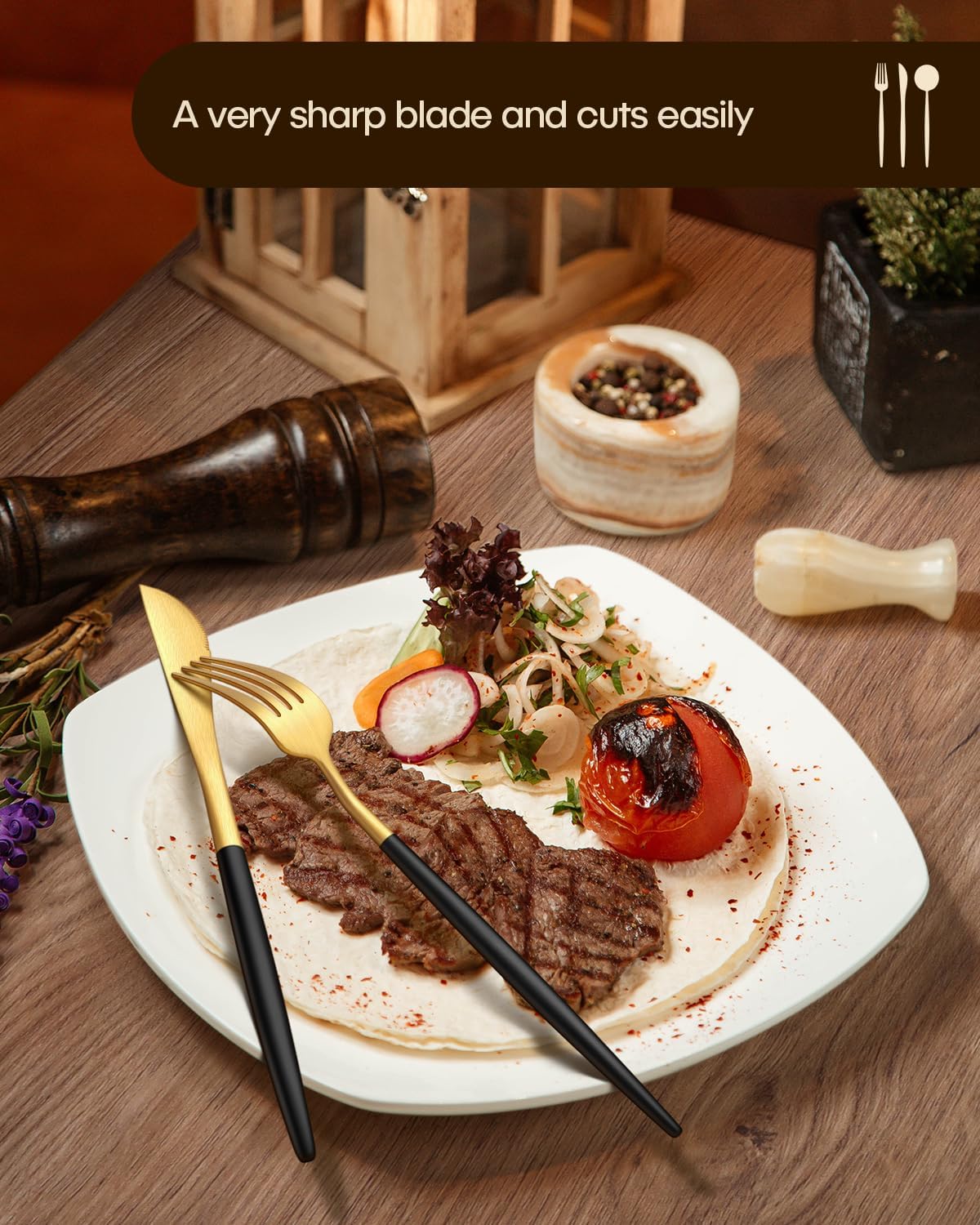 • BLACK AND GOLD SILVERWARE: Including 12 dinner knives, 12 dinner forks, 12 dinner spoons, 12 salad forks, and 12 teaspoons. These cutlery set for 12 are perfect for daily home use, and also for restaurants, pubs, cafes, and hotels