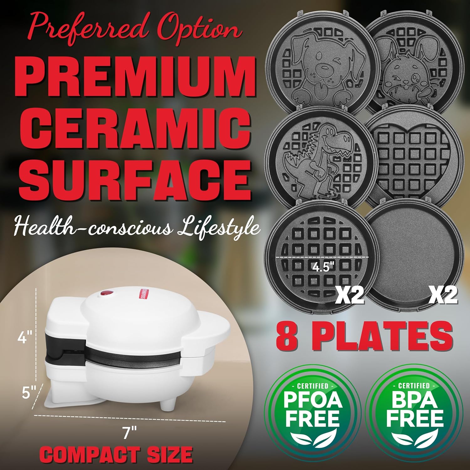 6-in-1 Mini Waffle Maker With Removable Plates, 4.5'' Mini Waffle Iron for Holidays, Parties & Events Waffle Maker Machine, 8 Plates with Premium Ceramic Coating, White