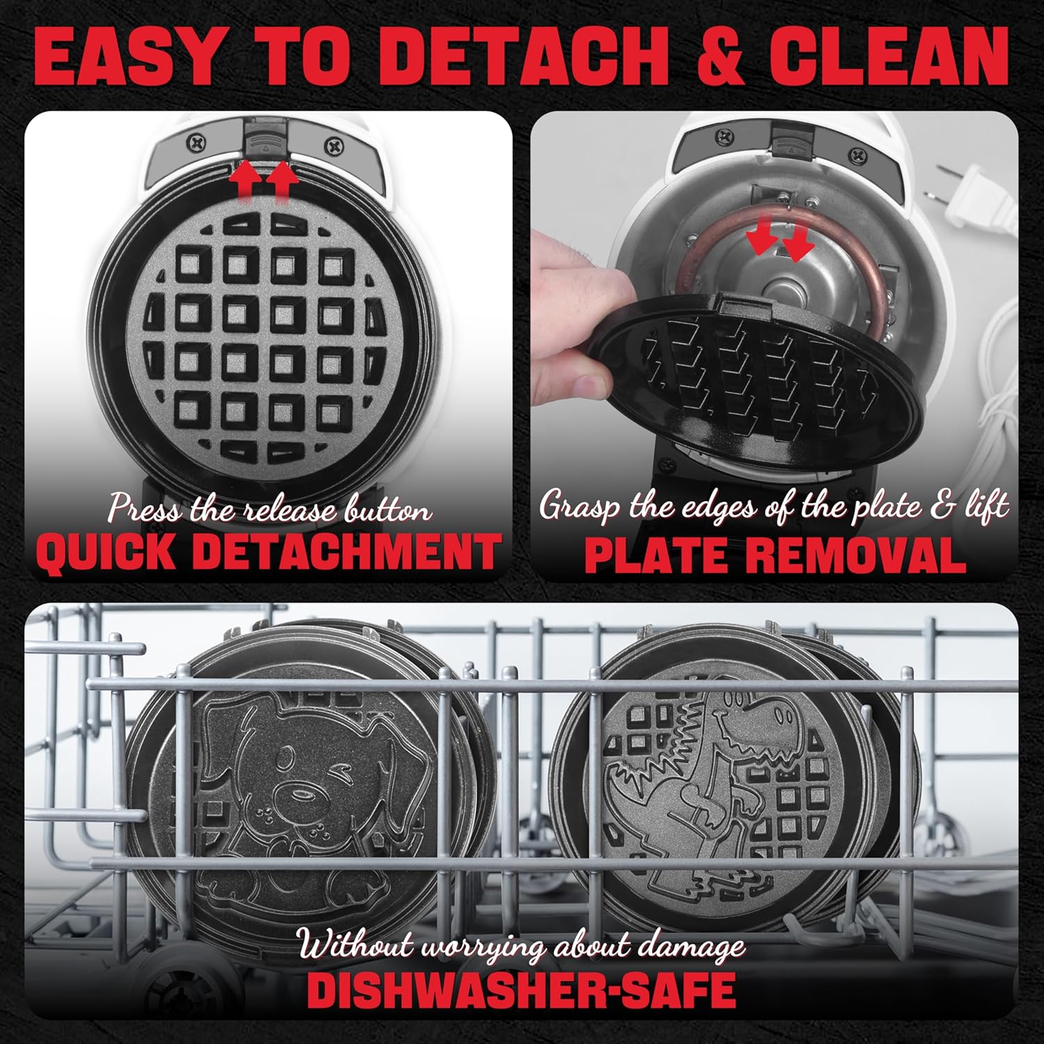 • [Effortless Cleanup with Removable Plates]: A highlight of this mini waffle iron is its removable plates, which slide out effortlessly and are dishwasher safe, making it an ideal choice for everyday use. This 6-in-1 waffle maker combines efficiency with ease of maintenance.