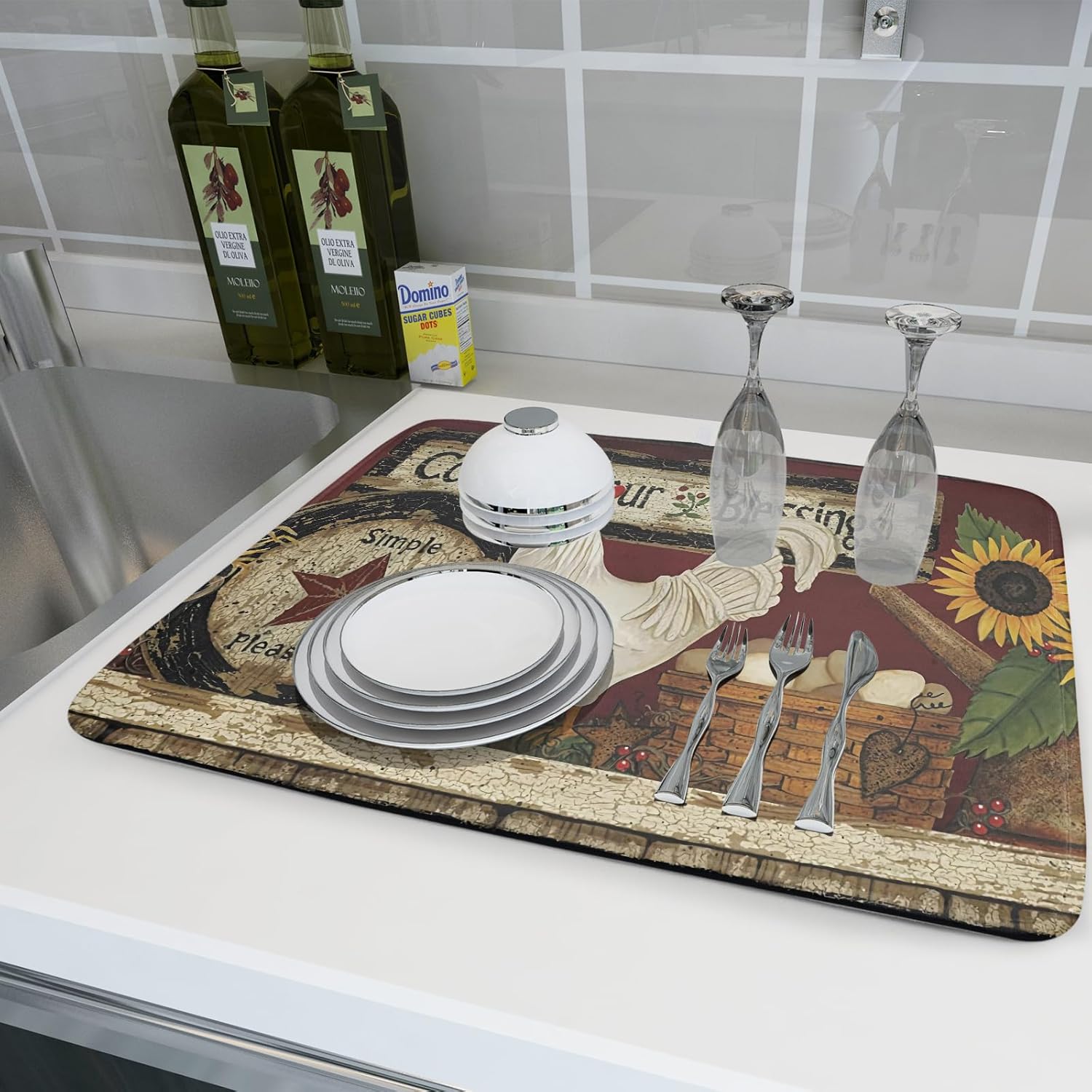 Giwawa Vintage Rooster Dish Drying Mat for Countertop, 18"x24" Farmhouse Chicken Dish Drainer Mats, Rustic Country Style Fast Drying Microfiber Dish Drying Pad Kitchen Accessories Decor Large