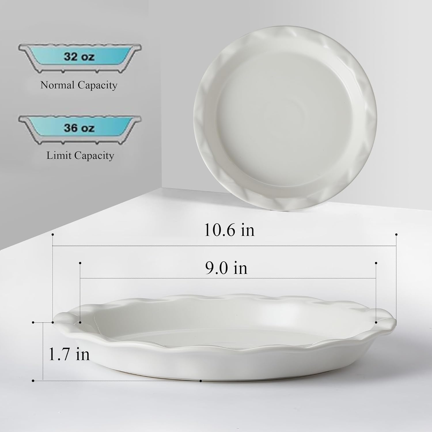 Lareina Ceramic Pie Pans for Baking, 9 Inches Pie Plate for Apple Pie, 36 Ounce Round Baking Dish, Set of 2, Thanksgiving day Gifts for Women, White