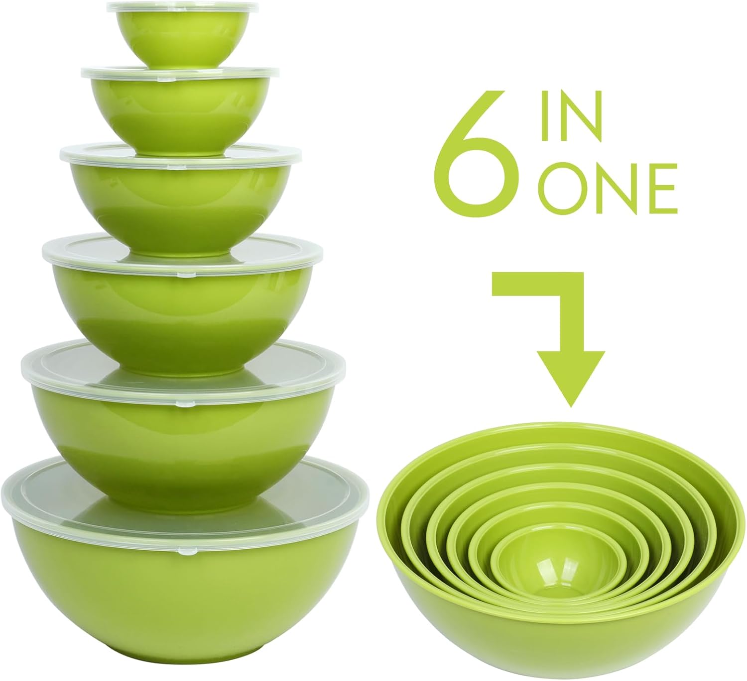 • [ 12 Piece Mixing Bowls Set ] - Set includes 6 plastic bowls and 6 TPR lids. Bowl capacity of 0.32 QT, 0.74 QT, 1.37 QT, 3.69 QT and 5.8 QT. Perfect for all your cooking, baking, and meal-prepping needs.