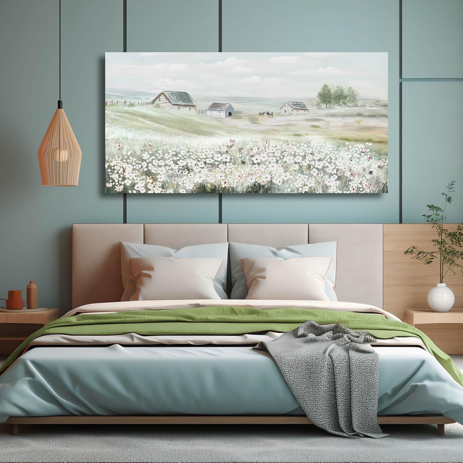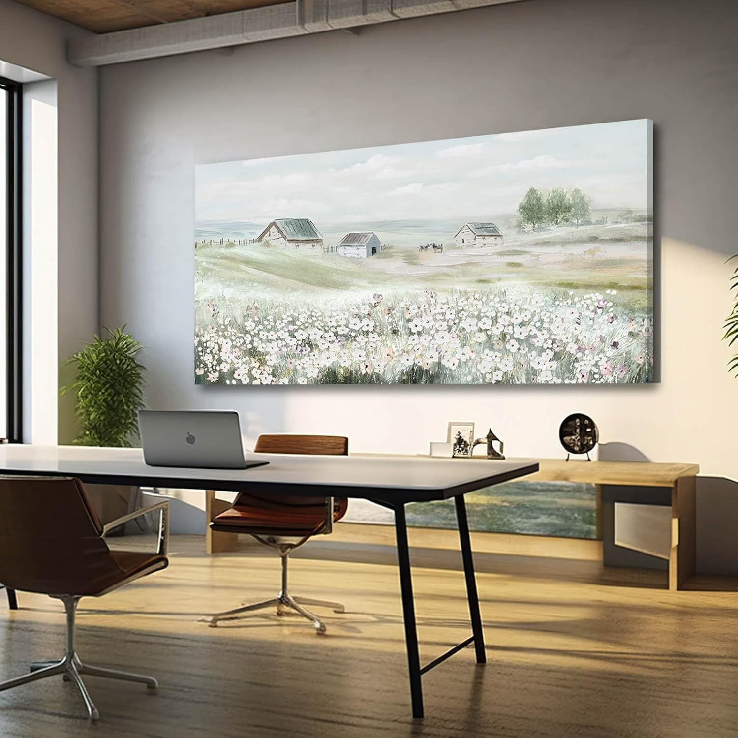 VAYIMDH Farmhouse Wall Art White Flowers Painting Rustic Scenery Green Pictures Wall Decor 24"x 48" Meadow Prints for Living Room Dining Room Bedroom Aesthetic