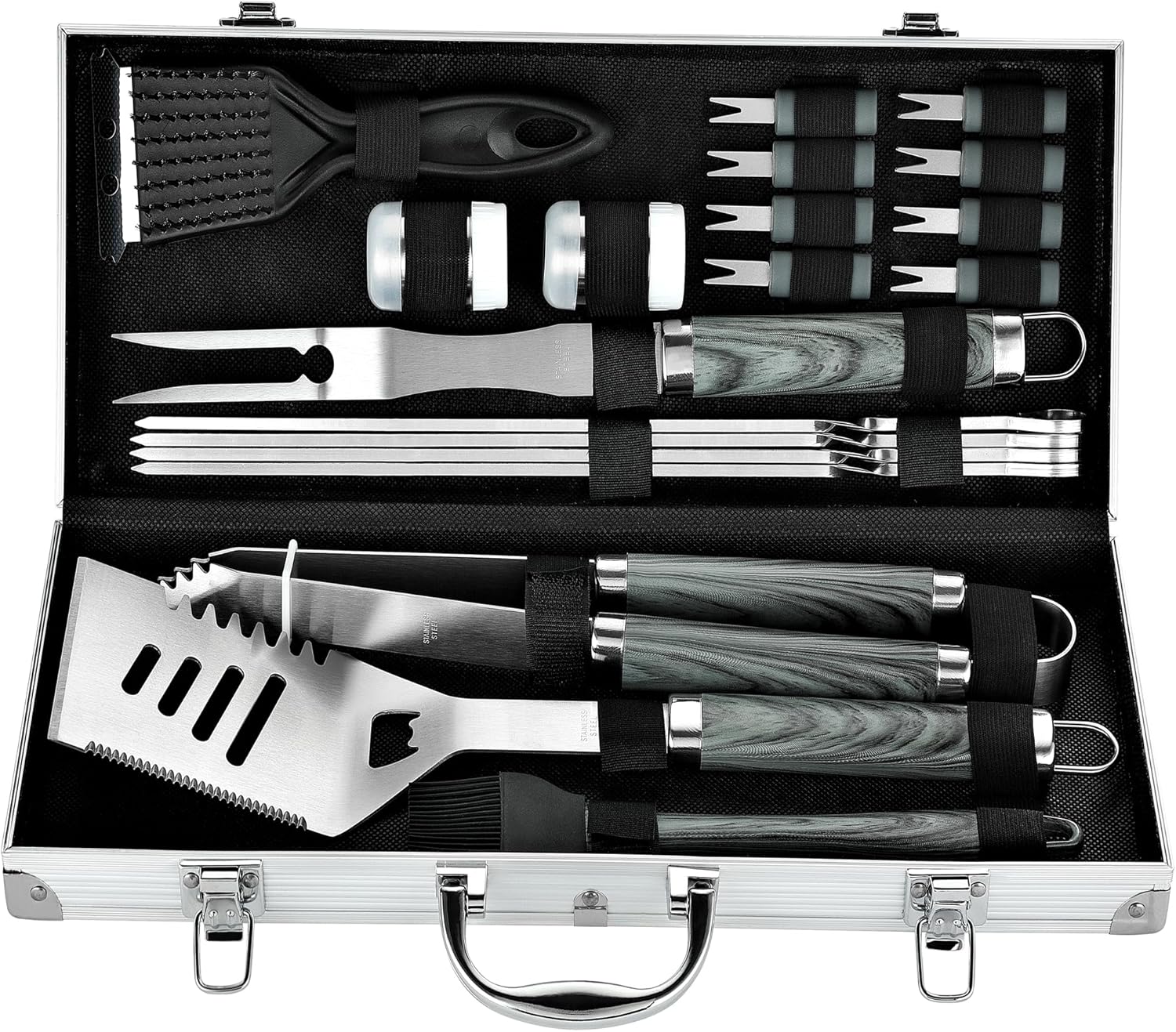 • Complete Grill Accessories Kit - Spatula, fork, tongs, basting brush, grill brush, salt&pepper shaker, 8 corn holders, 4 skewers, aluminium case.
