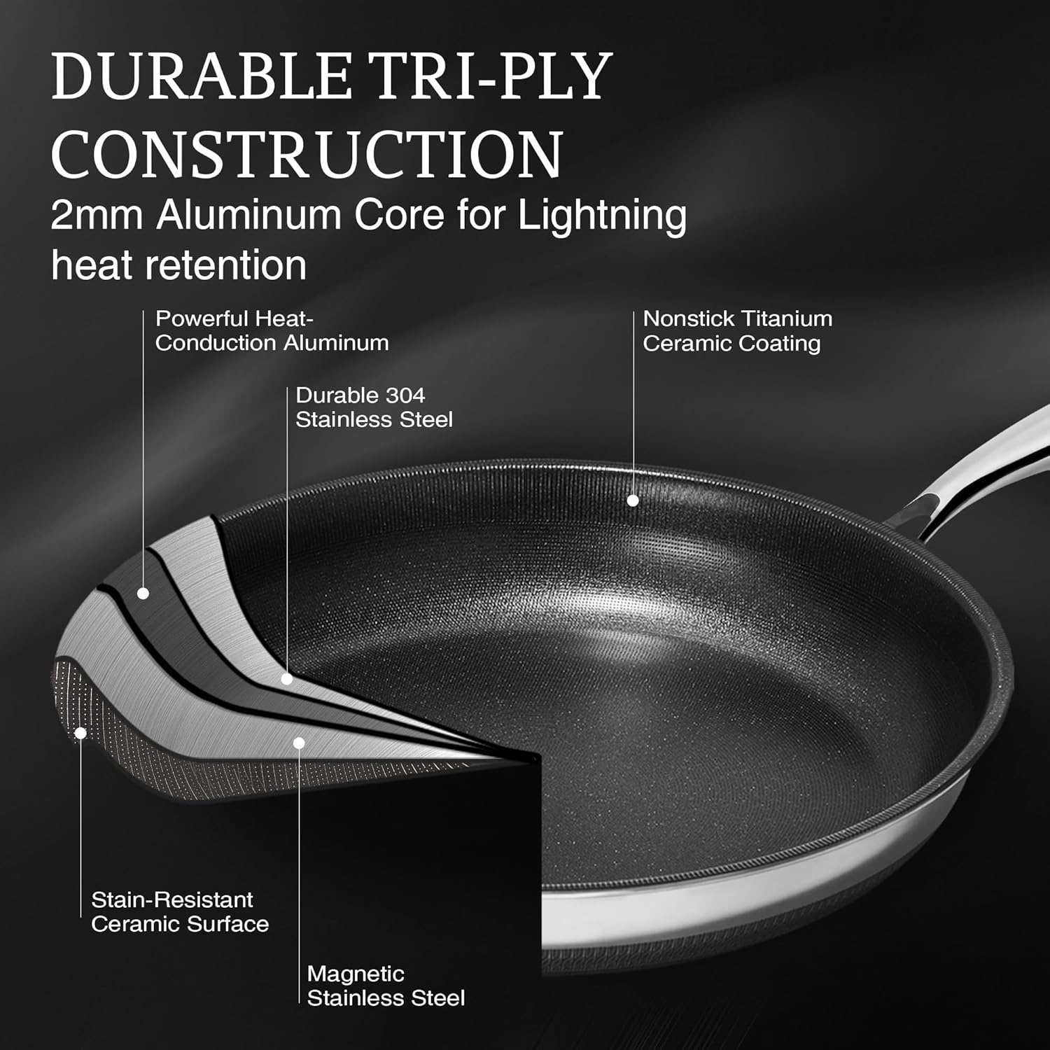 • 5-Layer Structure : The stainless steel frying pan features a nonstick titanium ceramic interior, a 4mm extra-thick aluminum core, and a dual-layer 403 stainless steel design, ensuring rapid and even heat distribution along with outstanding durability. The outer star-trail etched layer prevents yellowing caused by flames and stains. Its five-layer structure locks in heat, preserving flavors and textures for an exceptional cooking experience.