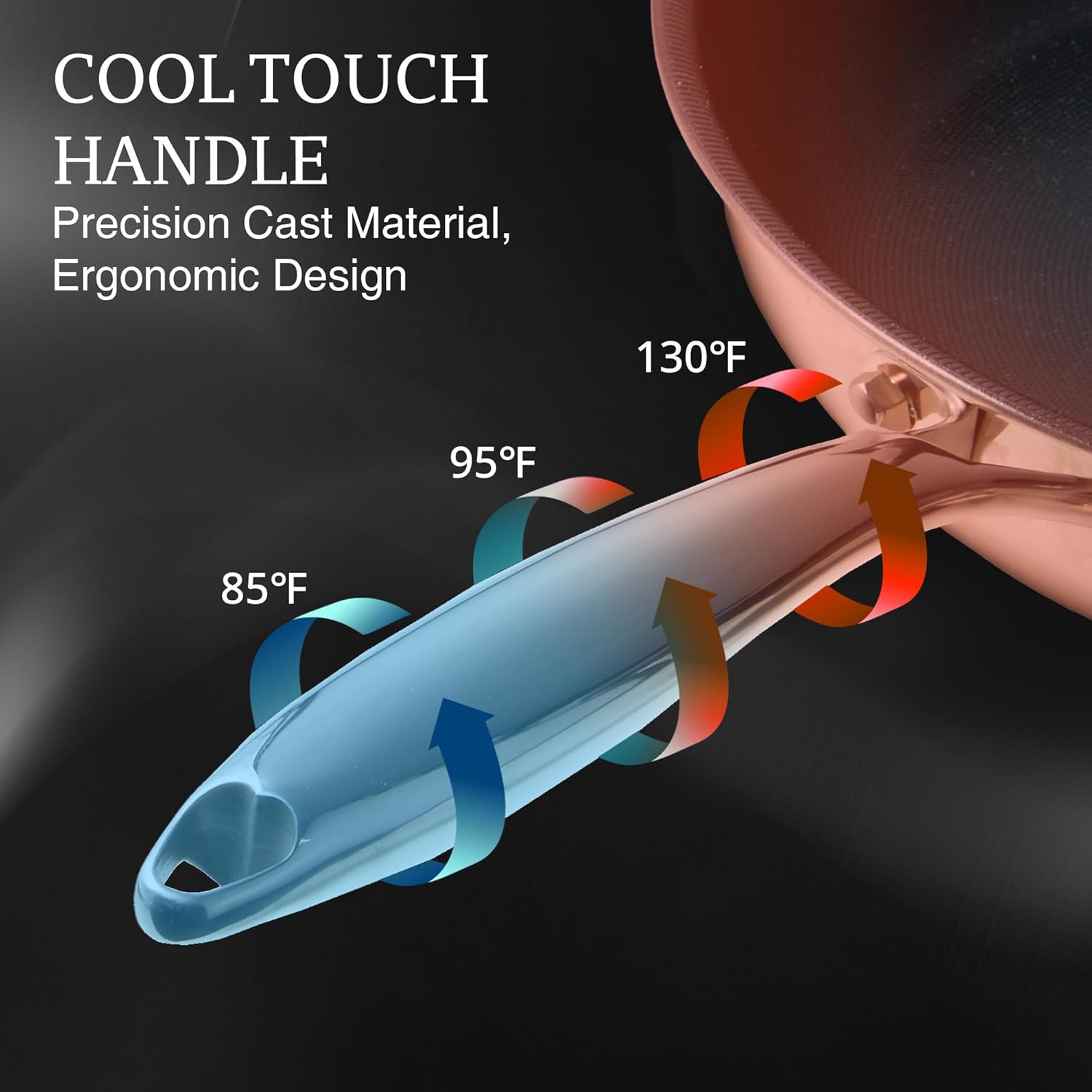 • 5-Layer Structure : The stainless steel frying pan features a nonstick titanium ceramic interior, a 4mm extra-thick aluminum core, and a dual-layer 403 stainless steel design, ensuring rapid and even heat distribution along with outstanding durability. The outer star-trail etched layer prevents yellowing caused by flames and stains. Its five-layer structure locks in heat, preserving flavors and textures for an exceptional cooking experience.