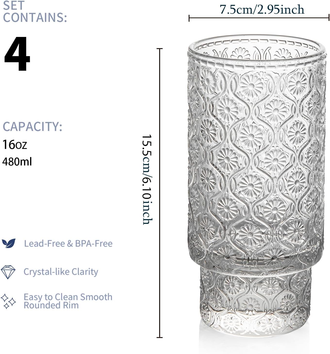 Drinking Glasses Set of 4, 16oz Textured Flower Design Cocktail Glasses, Stackable Old Fashioned Glass Cups, Vintage Glassware for a baby Shower Wedding for Kitchen and Bar - Dishwasher Clear