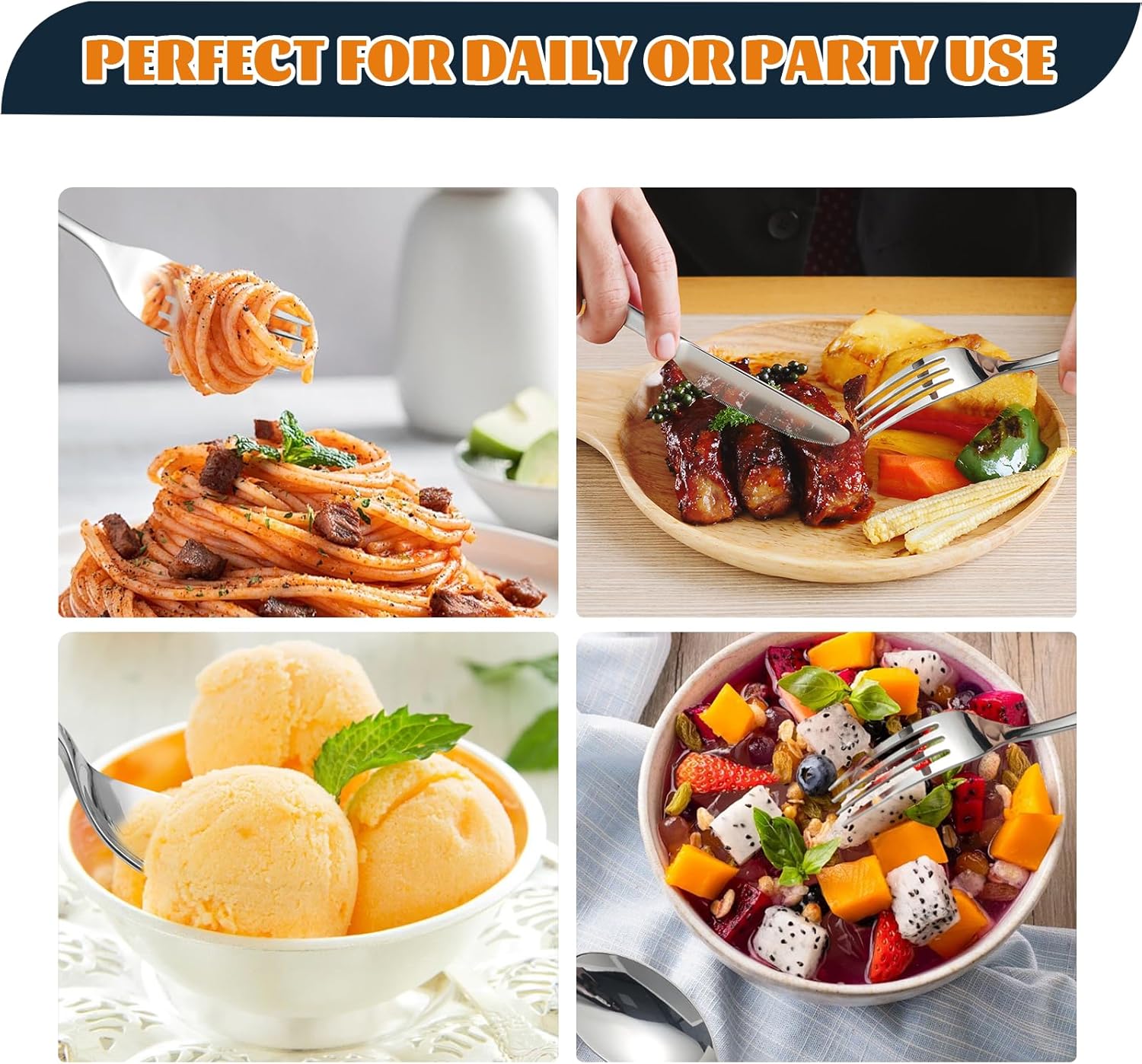 • HEAVY DUTY SILVERWARE SETS: The flatware set is thickened and weighted design to stand up to the rigors of everyday use. Each kitchen silverware sets weighs 0.8 lbs. In particular, the inside of the fork is carefully polished and smoothly rounded for a more comfortable and safer dining experience. The handle of the spoon, on the other hand, is more warped and thicker for easy gripping, while the bowl of the spoon is deepened to hold more food.