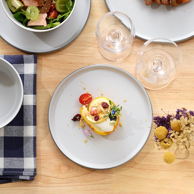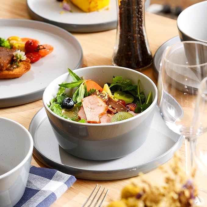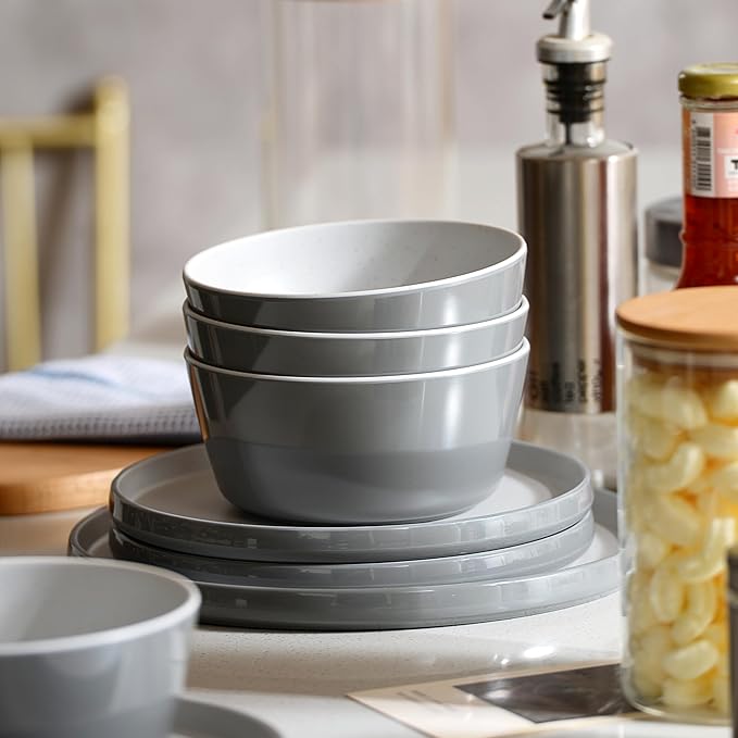 • UNIQUE TWO-TONE DESIGN: Melamine dinnerware sets present a deep and elegant light gray appearance, just like a tranquil painting. The interior is white with delicate spray dots, like stars or sea ripples. These dots show the uniqueness and add artistic vitality. Placed on the table, they give an artistic atmosphere instantly.