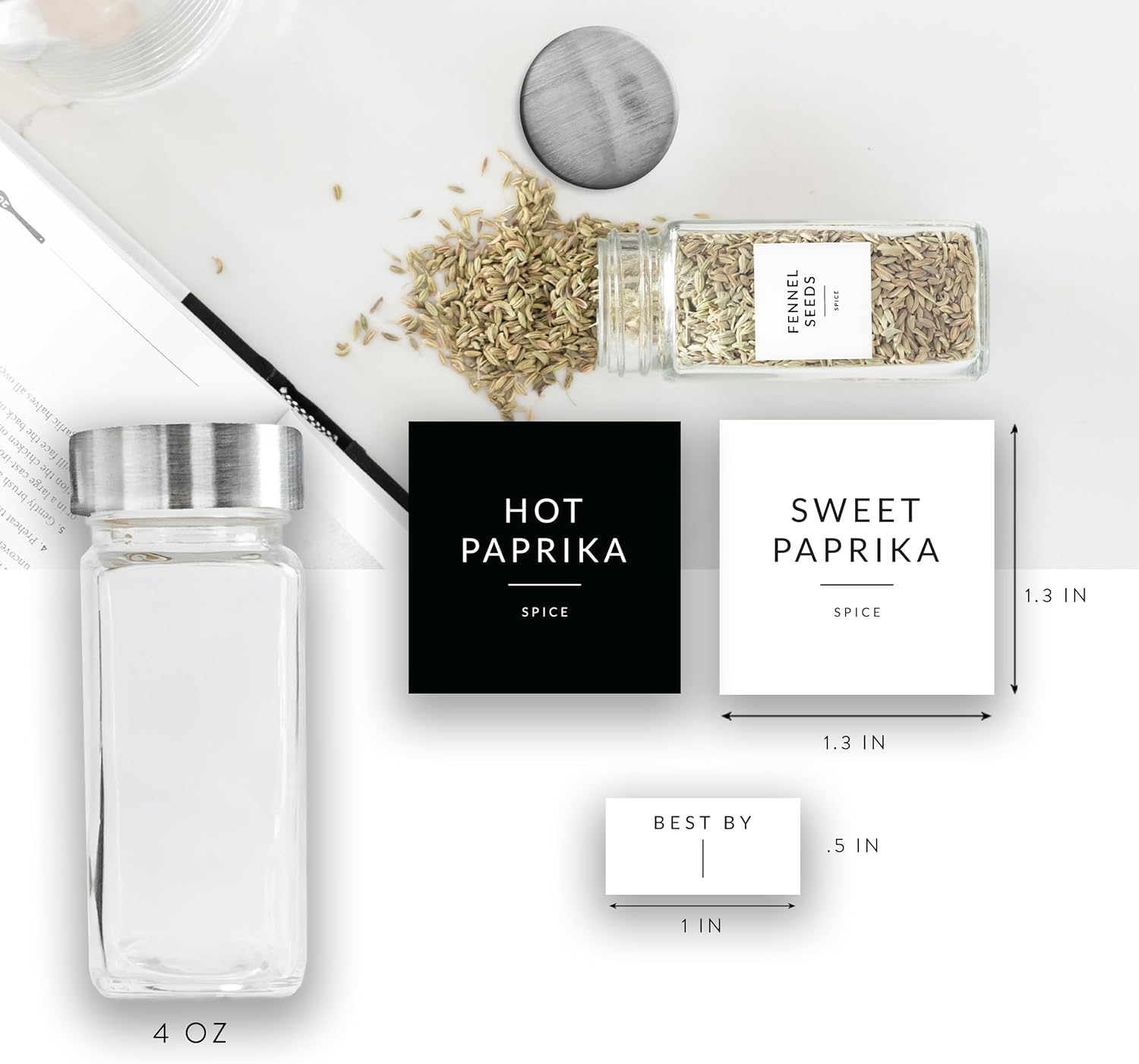 • 374 SPICE LABELS STICKERS - Complete Square Spice Jars Stickers Sets in Minimalist Labels design including a White Spice Labels, Black Labels, and 88 Food Date Expiration Labels to keep your Kitchen Organized and your Spices Fresh.