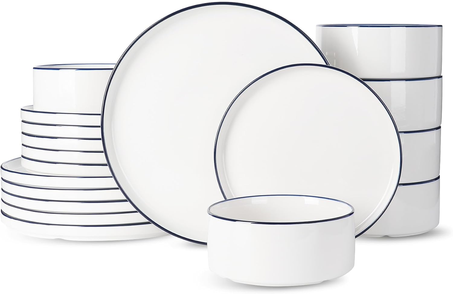 Famiware Porcelain Dinnerware Set, 18-Piece Modern Plate and Bowl Set, dish set for 6, Microwave and Dishwasher Safe Tableware, White with Blue Trim