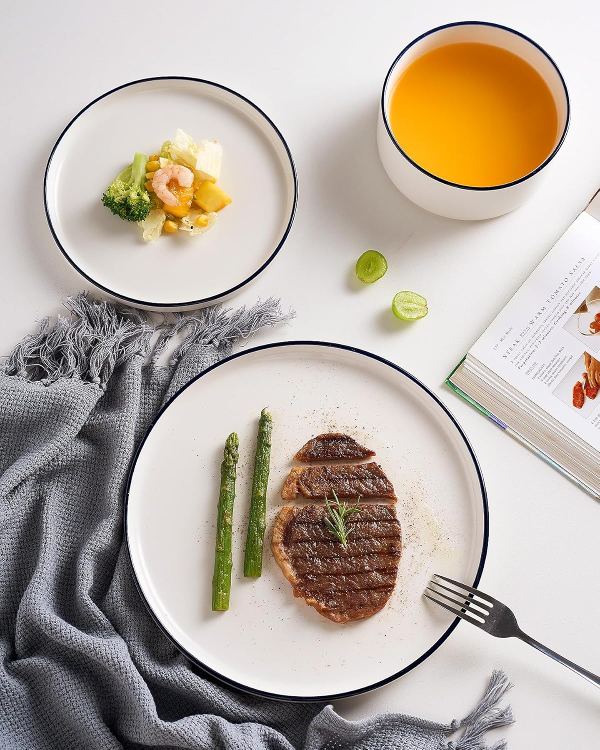 • 【High-Rimmed Edge Design with Blue Trim】Featuring high-rimmed edges, these kitchen plates prevent spills, ideal for sauces, condiments or soups. The elegant blue stroke along the edges contrasts with the pure white body, merging modern style and art—making the set a real standout at any table.