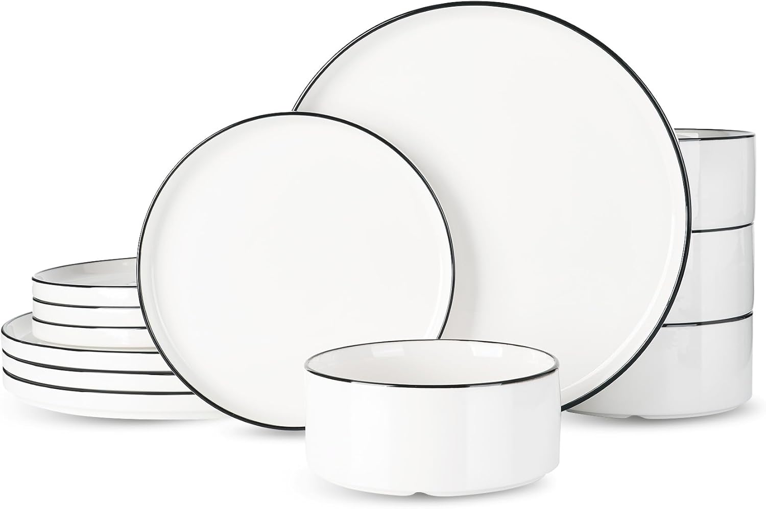 Famiware Porcelain Dinnerware Set, 12-Piece Modern Plate and Bowl Set, Dish Set for 4, Microwave and Dishwasher Safe Tableware, White with Black Trim