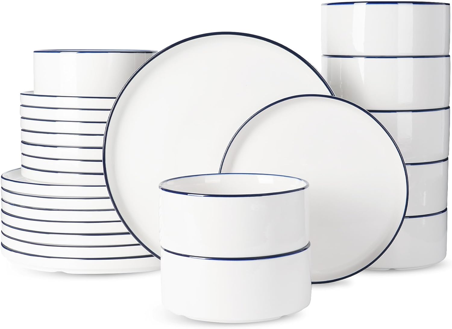 Famiware Porcelain Dinnerware Set, 24-Piece Modern Plate and Bowl Set, dish set for 8, Microwave and Dishwasher Safe Tableware, White with Blue Trim