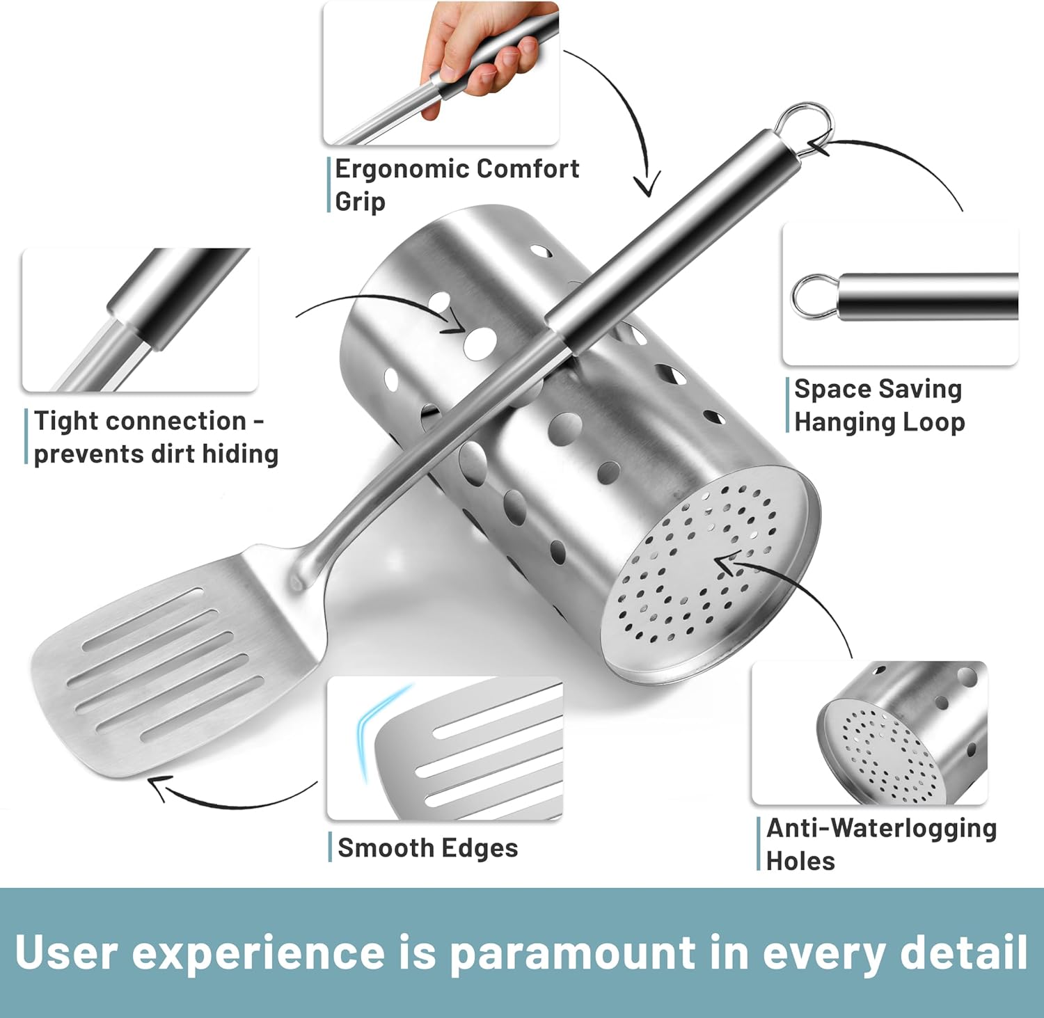 Pleafind Stainless Steel Cooking Utensils Set, 9 Pcs Heat Resistant Kitchen Utensils Set, Nonstick Kitchen Tools Set With Utensil Holder, Metal Spatula Set for Chef, Dishwasher Safe