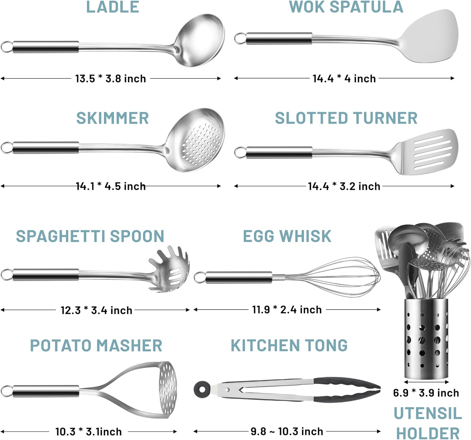 • 【Perfect Gift】Whether as a gift for family or professional chefs, or as kitchen essentials for new home or apartment, this stainless steel cooking utensils set is the perfect present for cooking enthusiasts. If you have any questions about our kitchen utensils set, don't hesitate to reach out us. We're here to help you