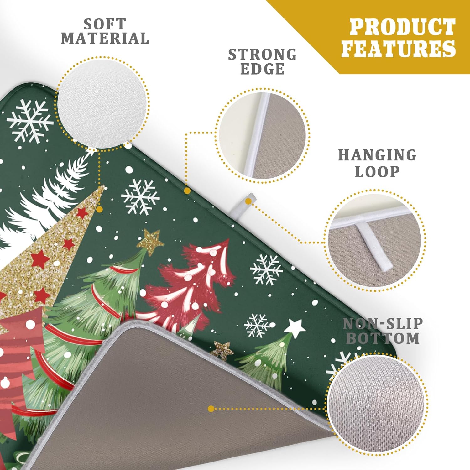 • 【ABSORBENT MATERIAL】-- This Christmas trees dish drying mat is made of absorbent microfiber and composite sponge material in the middle, which quickly absorbs water to keep the kitchen countertop dry and clean. Use alone or together with a dish drainer. Our no-slip base adds stability when drying glassware or other fragile items.