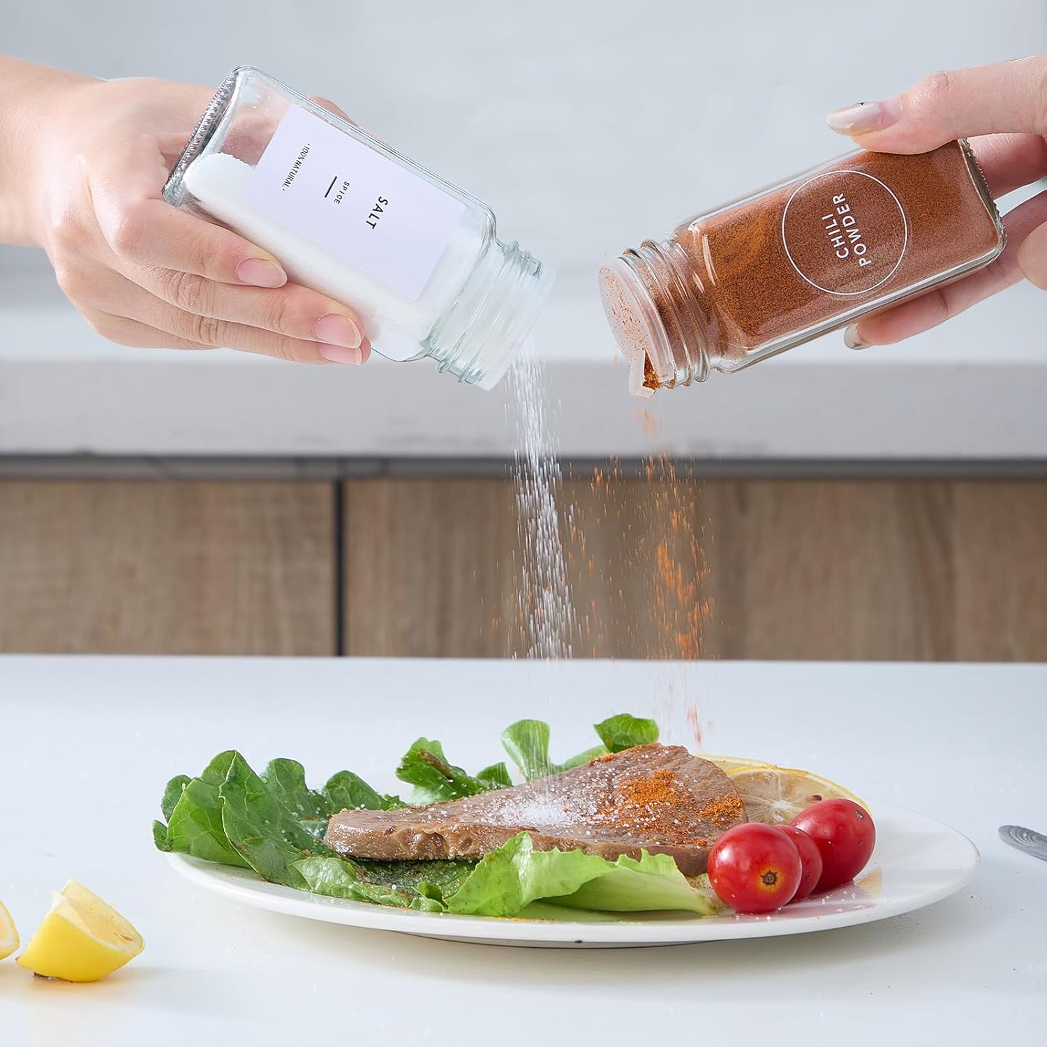 • HIGH QUALITY GLASS: The square spice jars with labels are made of high quality glass. Clear glass let you have a clear look of spices. Our modern square seasoning containers fit any drawer, cabinet, spice rack, cupboard, or organizer.
