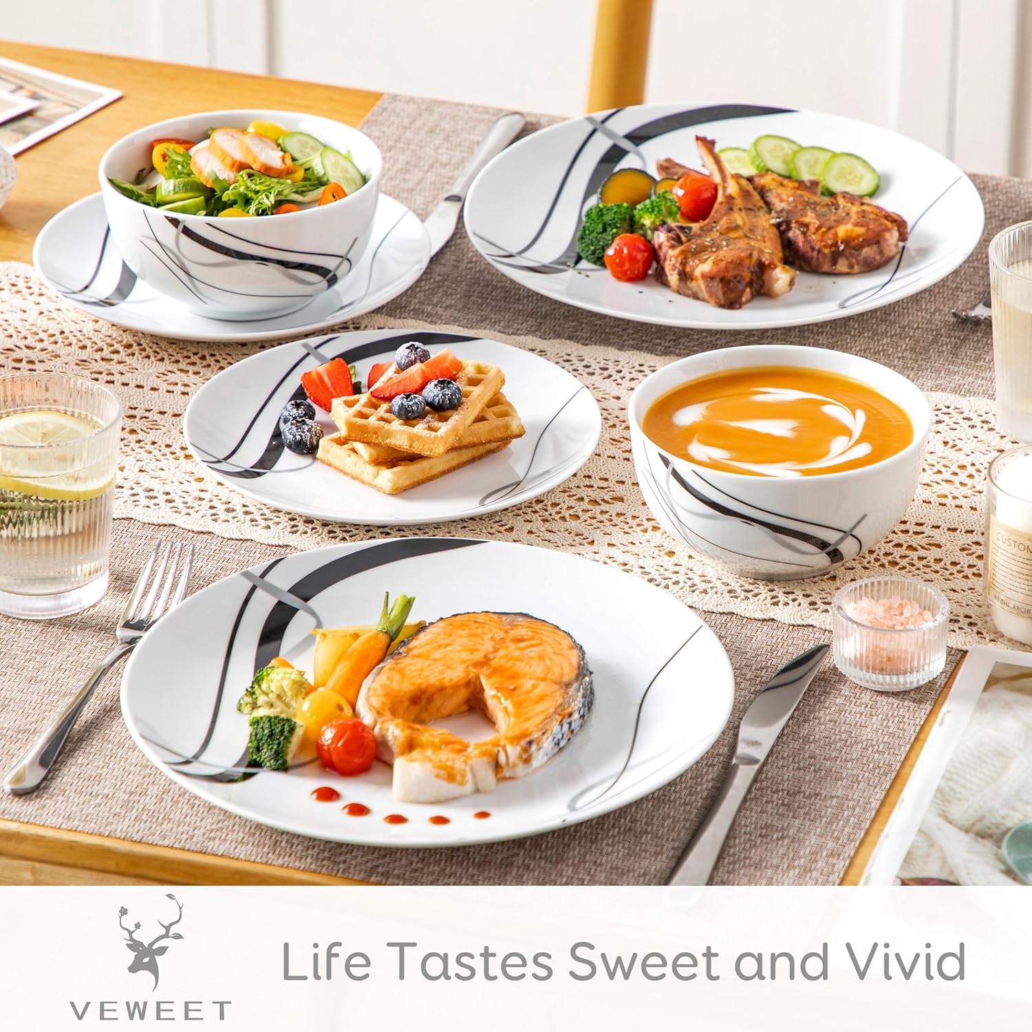 VEWEET Porcelain Dinnerware Sets for 4, 12 Pieces Plates and Bowls Set with Black and Grey Ribbon Lines, Dishes Set Dining Ware for Dinner, Microwave and Dishwasher Safe, Series FIONA