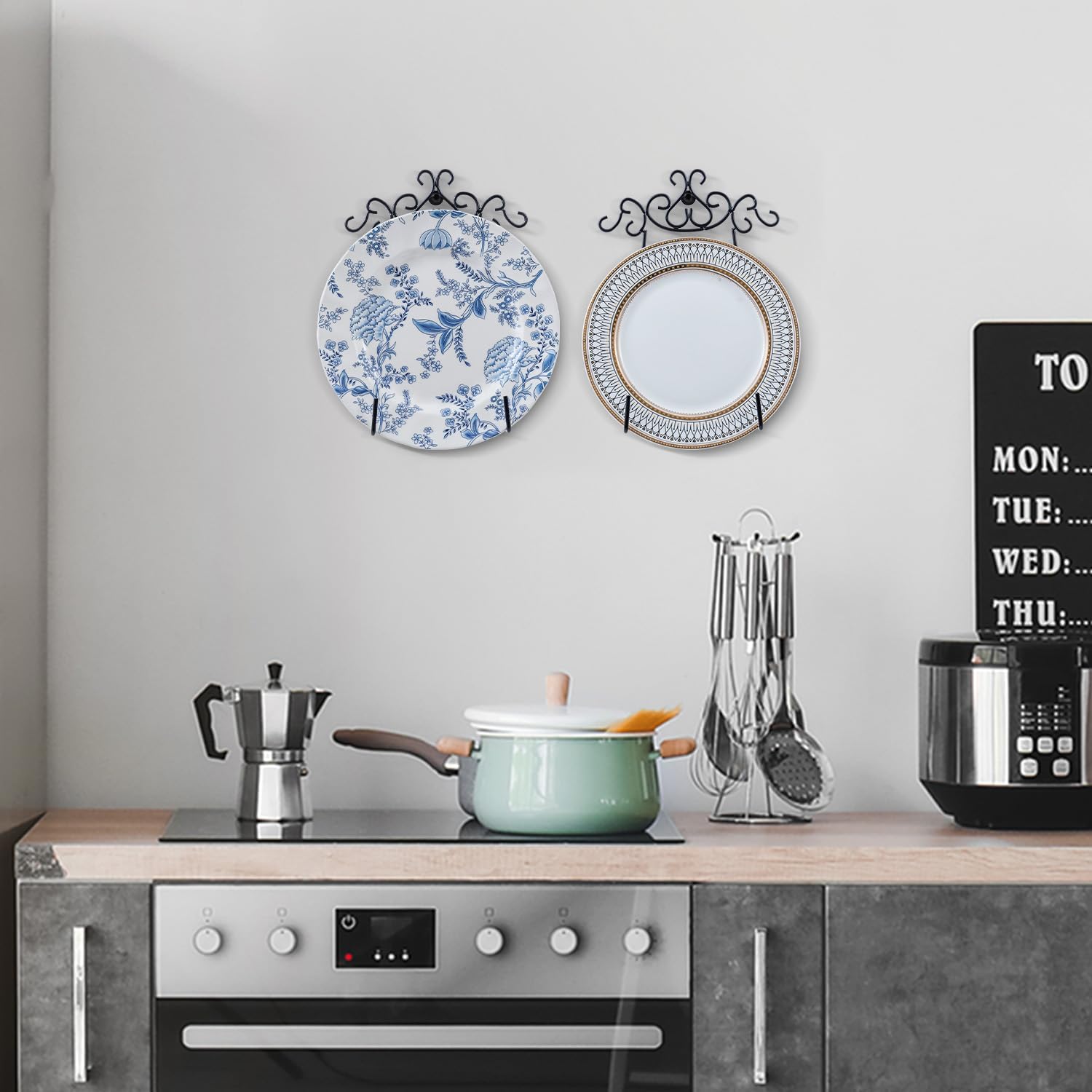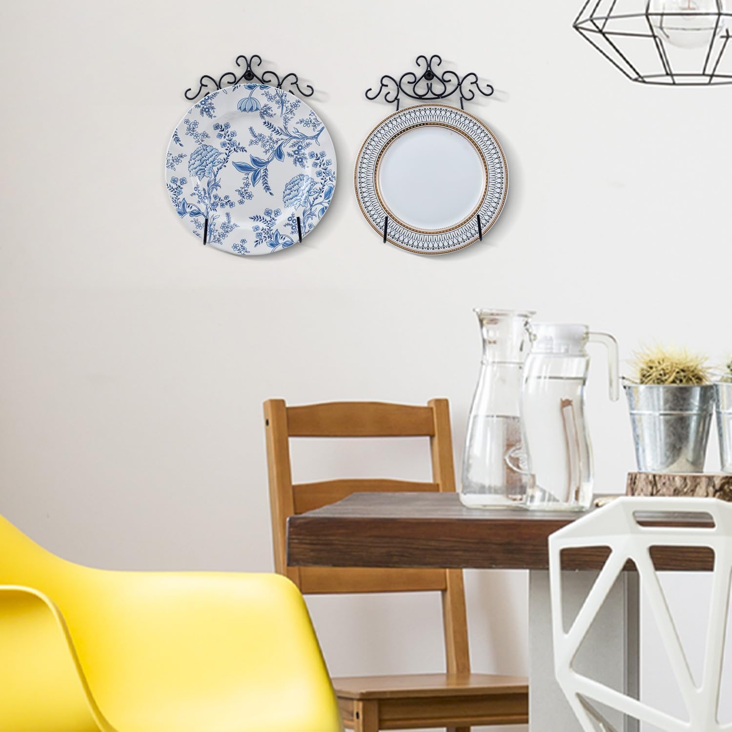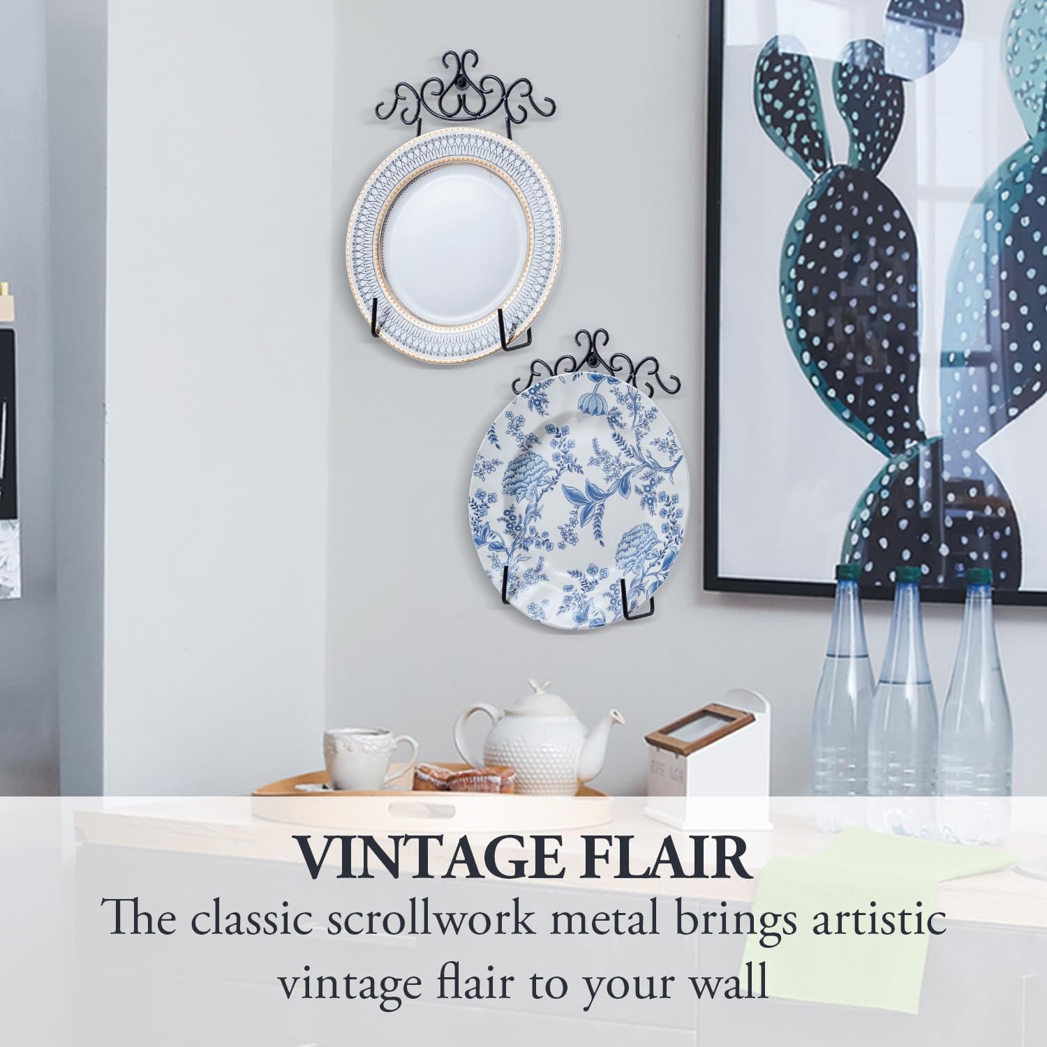 MyGift Vintage Scrollwork Black Metal Hanging Plate Holder, Set of 2 – Wall-Mounted Plate Display Rack for Collectible Plates & Platters – Holds Up to 8-Inch Plates