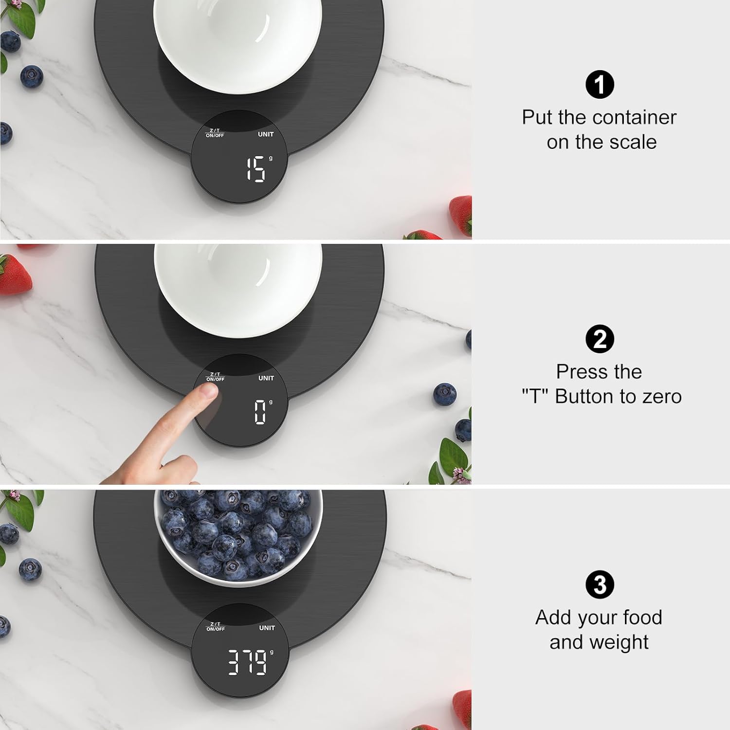 • Battery Included: The food scale is powered by three (3) AAA batteries, which are included. It automatically turns off after 120 seconds of not being used