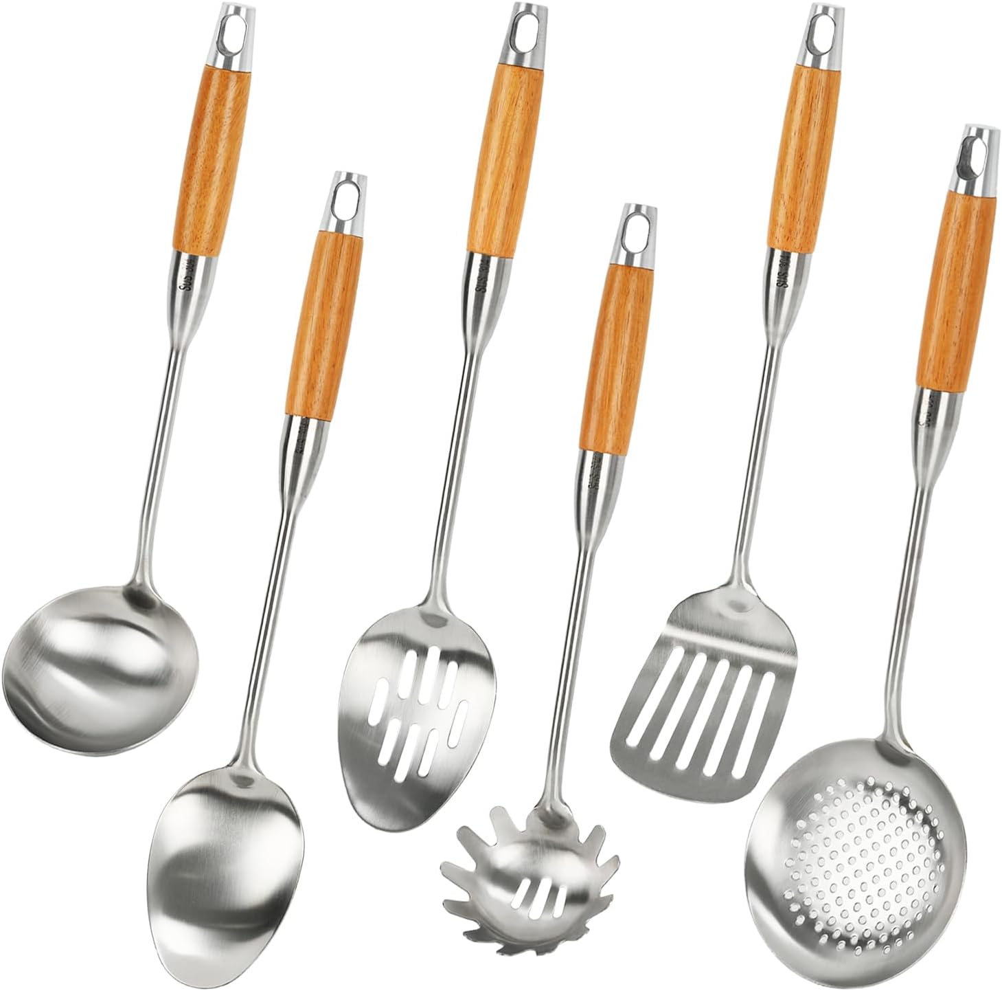 18/8 Stainless Steel Kitchen Utensils Set with Wood Handle, 6 Pcs 15 inch Cooking Utensils Tools, Turner, Ladle, Spoons & Pasta Server