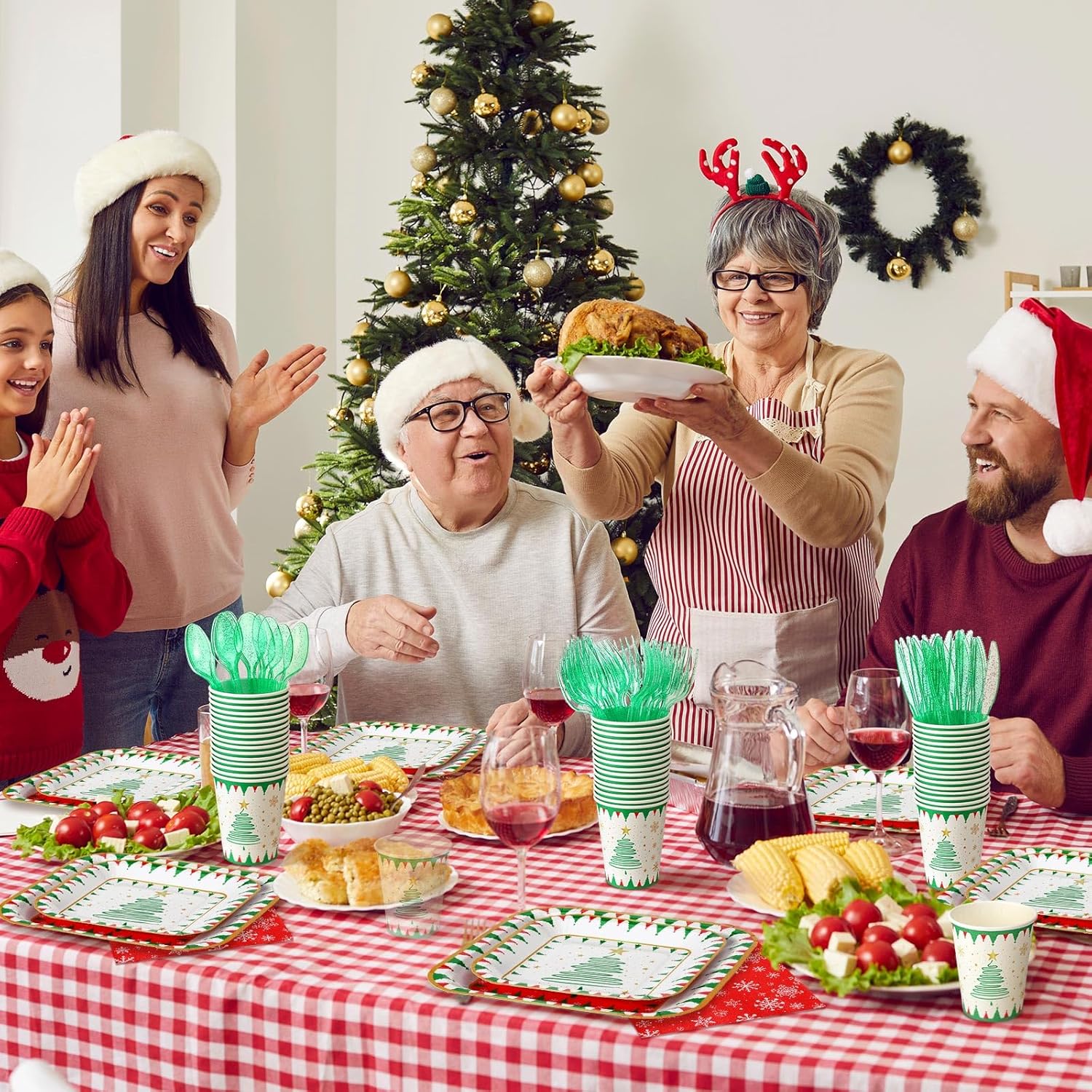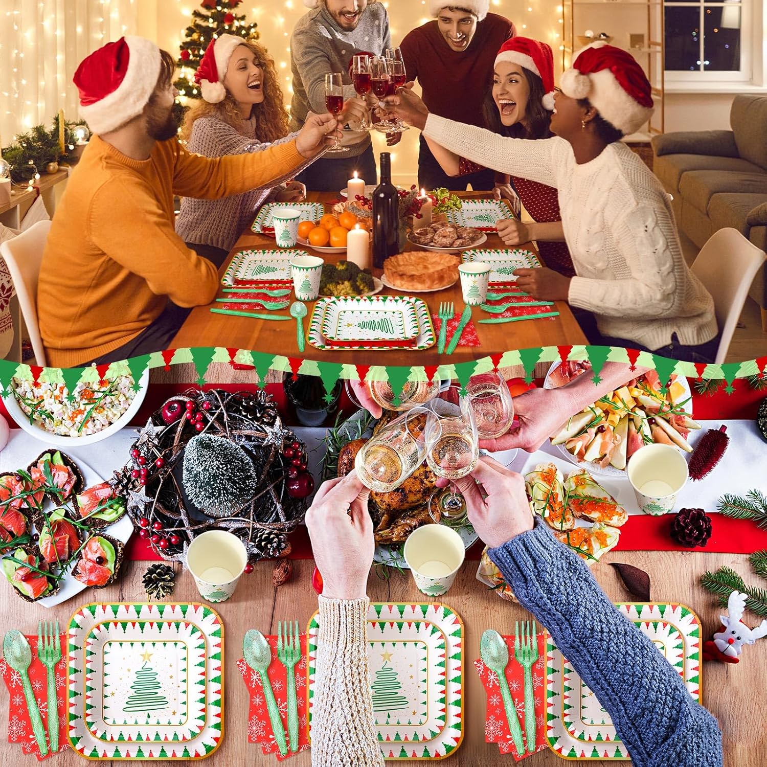 350 Pcs Paper Plates and Napkins Set Disposable Dinnerware Party Supplies Tableware Serve 50 Guest Cups Knife Forks Spoon(Red, Green,Christmas Tree)