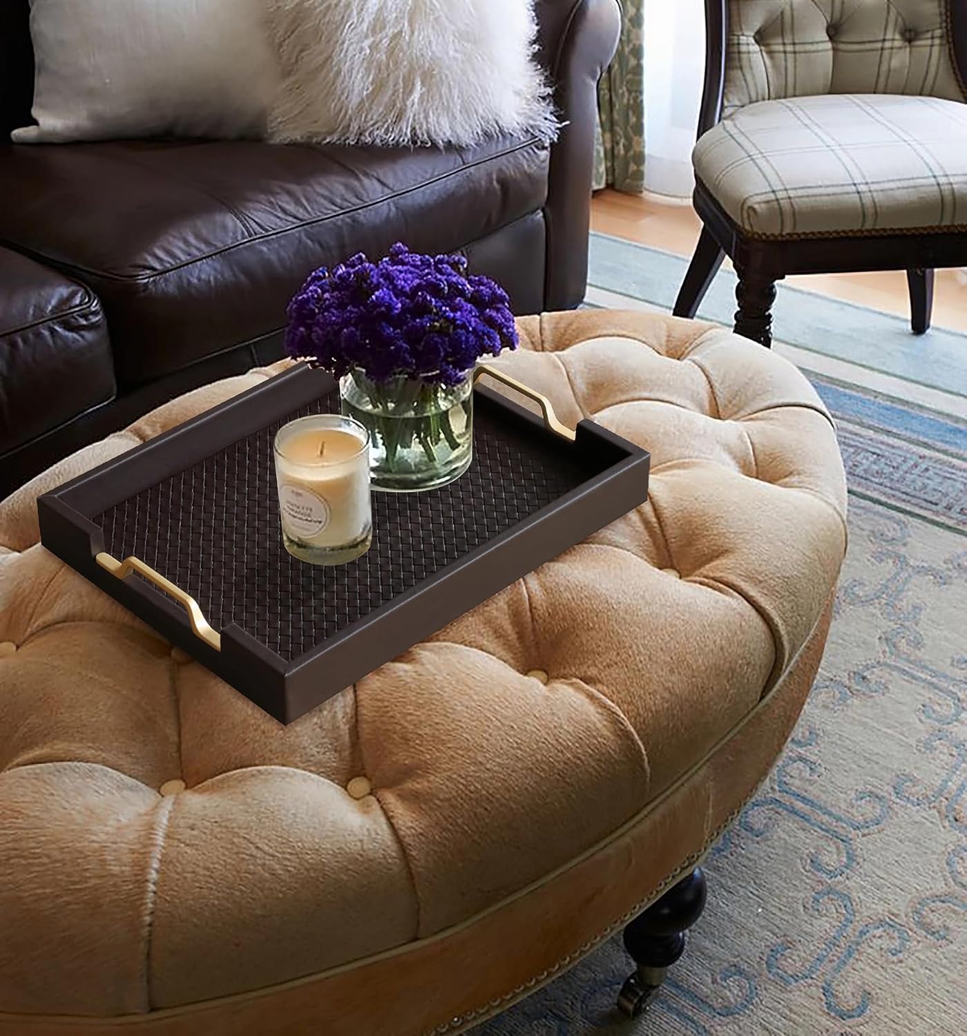 • Sturdy Construction: Crafted from durable materials, the tray features a smooth black finish and convenient handles. Made of beautiful faux leather, mdf, velvet, ottoman tray dimension: 16.2 x 12.2 x 2 inches.
