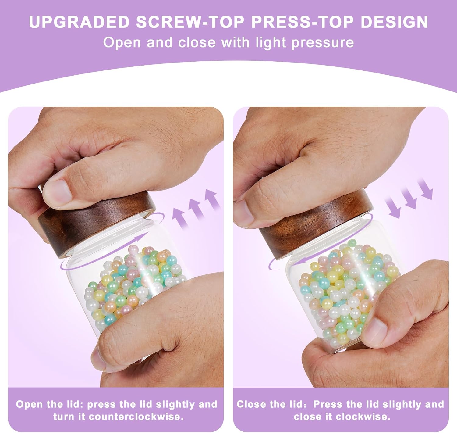 • Clear Design: Transparent glass containers al- AIRTIGHT WOODEN SCREW ON LID:Small glass jar has a wood screw lid with a sealing rubber ring, which effectively isolates air, prevents food from oxidizing, and keeps your food dry and fresh,they are better at keeping moisture out than pop-on lids.These mini glass bottles with leakproof cap design, Perfect for Juice, Ginger shot, Liquid, Beverage Sample, Oils, Whiskey, Coffee, Tea, Liquors, Syrup, Spice, Honey,They can also be used to fill all kinds of solids or powders.low you to easily identify contents at a glance.