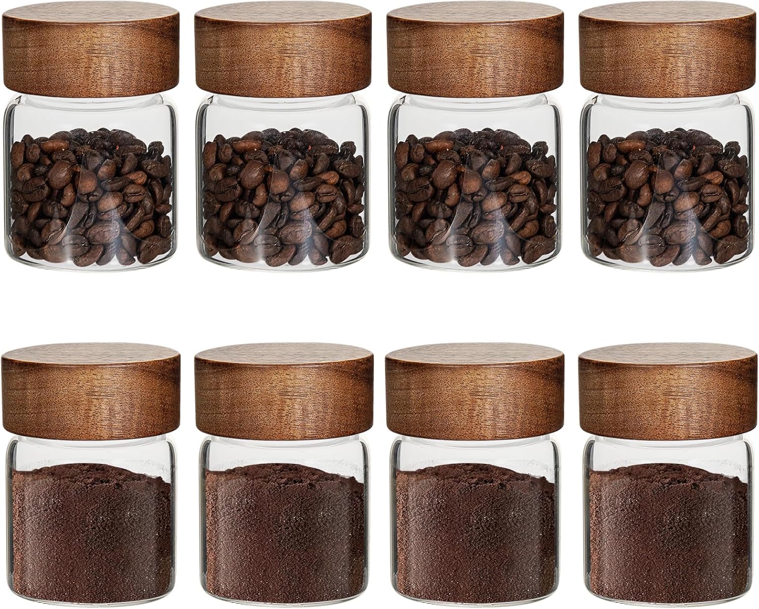 • - MULTIPURPOSE GLASS FOOD STORAGE CONTAINER SET: Kitchen glass jar short spice jars set includes 8 sets ( 8 pcs 4 oz/100ml ),meeting all your storage need,small glass bottles with lids perfect for storing and preserving a variety of ingredients including pasta, ground coffee,cookies,dried beans, pepper, jams, chutneys, rice, sugar, flour, tea, coffee beans, spices, biscuits, candy,cheese,flour, sugar, seeds,nut,cashew,Grains, flour,cereal storage ,etc. In addition to kitchen storage, it is also suitable for baking fermentation jars, kimchi pickling, brewing and so on.