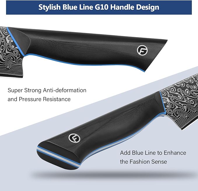 • 【Stylish G10 Handle】The handle of this chef knife is made of G10 material, which is extremely durable. The blue line design runs through the handle, which not only retains perfect durability but also adds a sense of fashion, suitable for all people.