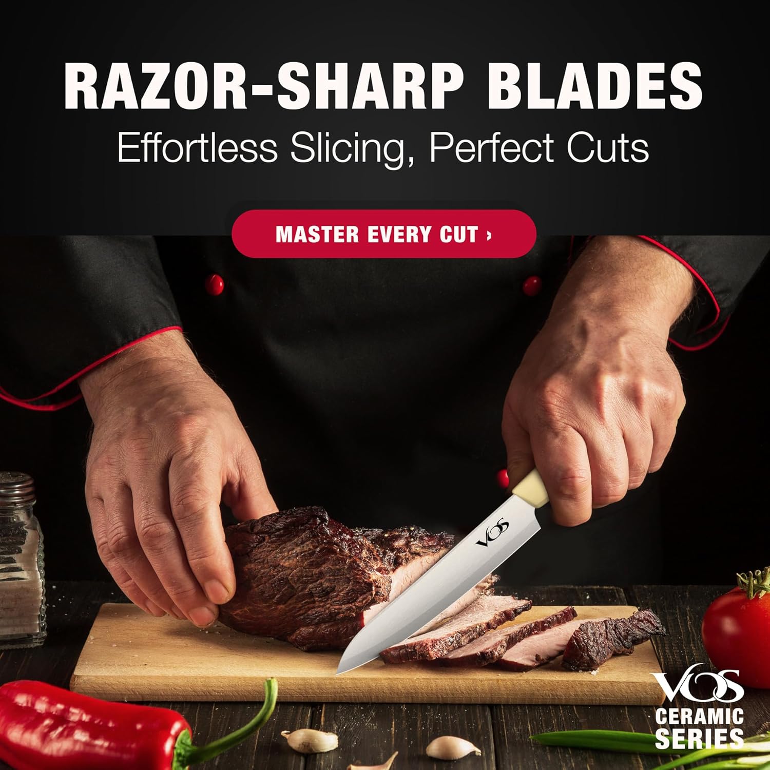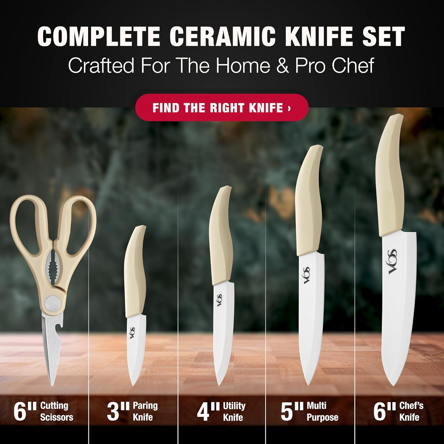 Vos Ceramic Knife Set in Elegant Gift Box, Ceramic Knives Set For Kitchen, Ultra Sharp Kitchen Knife Set & Covers, 3" 4" 5" 6" Paring, Santoku, utlity & Chef Knife, Scissors included (Off-White)