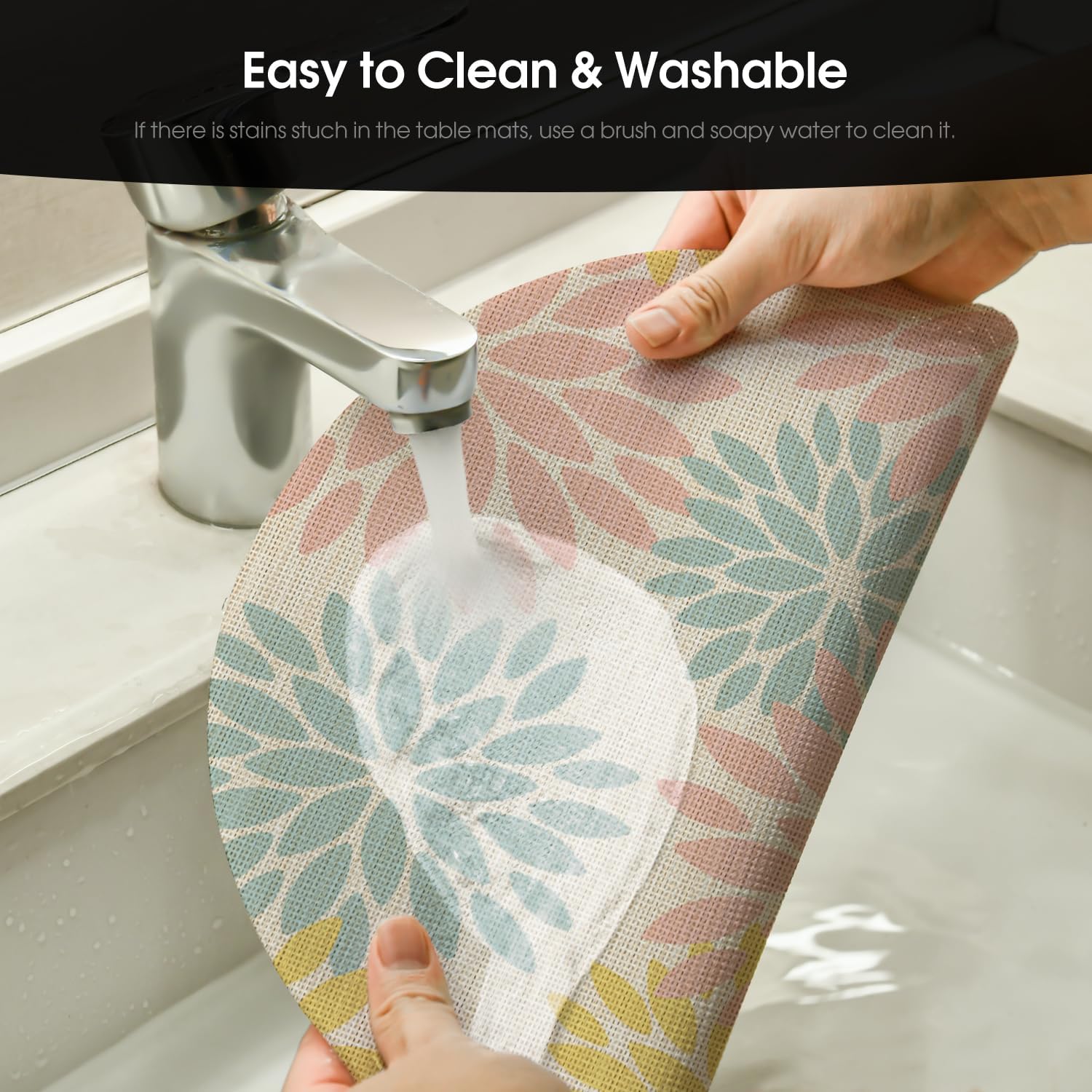 • Easy To Clean:The washable placemats simply wipe with soap,water and a soft sponge or cloth.Scrub stubborn stains with a soft bristle-brush and a bleach-based cleanse.