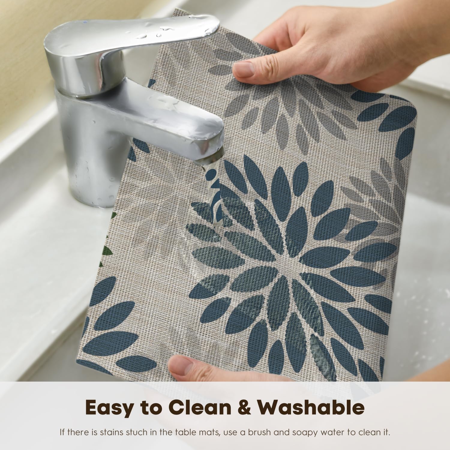 • Easy To Clean:The washable placemats simply wipe with soap,water and a soft sponge or cloth.Scrub stubborn stains with a soft bristle-brush and a bleach-based cleanse.