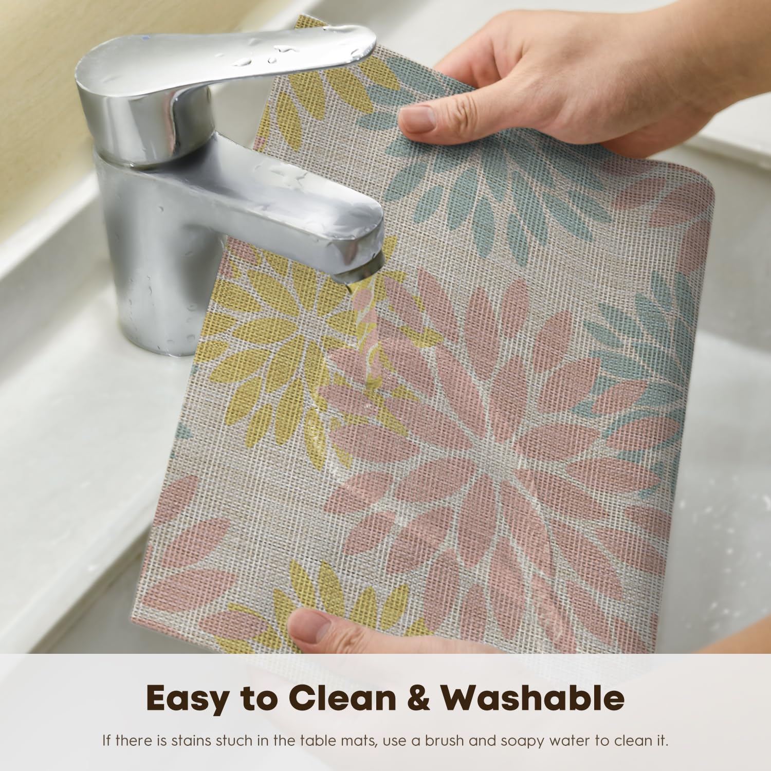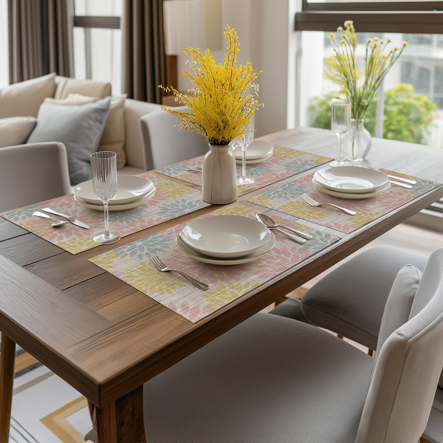 Artoid Mode Floral Vinyl Placemats Set of 4, 12x18 Inch Heat Resistant Washable Non-Slip Plistic PVC Place Mats for Party Kitchen Dining Decor, Pink Blue