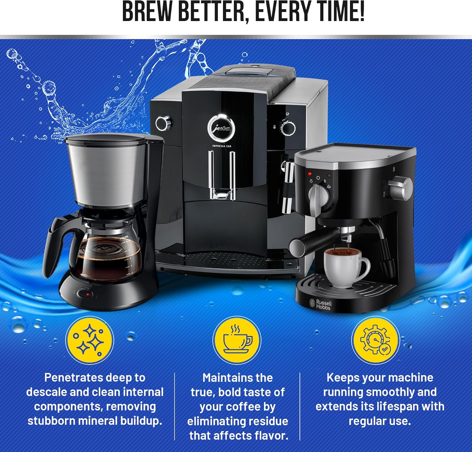 • Versatile Compatibility: These descaler tablets are designed to work seamlessly with all major coffee machine brands and models, including Keurig, Nespresso Vertuo, Breville, Ninja, Braun, Cuisinart, Affresh, Philips, De Longhi, biocaf, Dezcal, Oxo, and more. Whether you’re maintaining a pod-style system or a multi-cup drip machine, Bastion’s universal formula offers the convenience and flexibility you need. Simplify your routine with a single solution that tackles the toughest challenges, so you can focus on enjoying your favorite brews without interruption.
